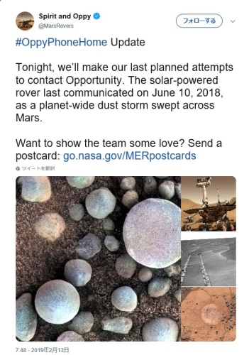 まるでヘマタイトのような鉱物、通称Martian 'Blueberries'を火星で見つけたOppy こと火星探査機の Opportunity はNASA が機能停止を発表してこのほど15年のミッションを終えることに。おつかれさまでした...(;_;) #ThanksOppy !手紙を送ったto be continued...!?buzz KOREAClick...にほんブログ村 韓国映画にほんブログ村 映画にほんブログ村 映画評論・レビューにほんブログ村 韓国情報にほんブログ村 K-POPにほんブログ村Copyright 2003-2022 Dalnara, confuoco. All rights reserved.本ブログ、サイトの全部或いは一部を引用、言及する際は著作権法に基づき出典(ブログ名とURL)を明記してください。無断で本ブログ、サイトの全部あるいは一部、表現や情報、意見、解釈、考察ロジックや発想(アイデア)・視点(着眼点)、写真・画像等もコピー・利用・流用することは禁止します。剽窃厳禁。悪質なキュレーション Curation 型剽窃、つまみ食い剽窃もお断り。複製のみならず、切り刻んで翻案等も著作権侵害です。