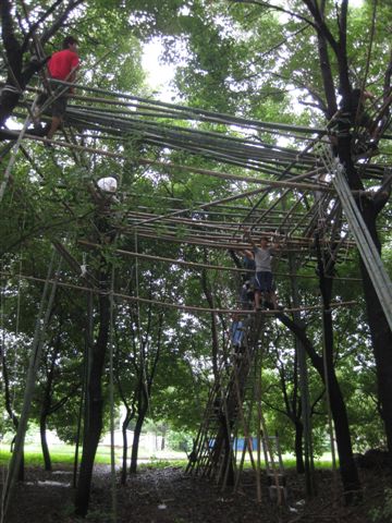 それぞれの コーナー に 跨 って 竹 を 通 し、 一 つずつ 結 んでいきます。