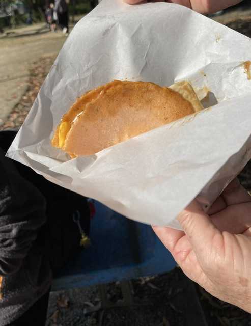 地元のコミュニティ祭りで毎年人気の屋台 「たません」。 えびせんべいにお好み焼…