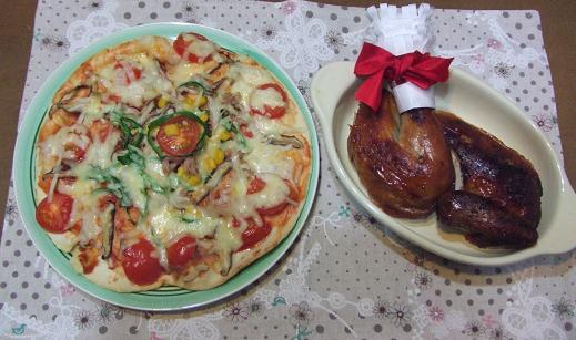 先日いただいたチキンはこんな感じでこんがり仕上がりました息子がピザを食べたいと言ったので、ホームベーカリーで生地を練り、全部で3枚焼きました息子のデザインです2枚はケチャップソースに定番 ソーセージ、ツナ、トマト、ピーマン、シイタケ、コーンを好きなように乗せました。もう一つは 焼き肉のたれで、合挽きミンチのそぼろをベースに上記の具をちりばめた感じです ピザ生地は練りあがって寝かせた後、一度トースターで焼いておくと生っぽくなくカリッと仕上がって美味しいなぁと考え、うちではその上にトッピングしています 味はばっちりビーフシチューとポテトフライも付けました。 同時進行で息子はサンタさんに食べてもらうクッキーを一生懸命作っていました 大変な作業でしたが、いただきますをしてから・・・3人のお腹にあっという間に~~ そのあとケーキを食べましたが、ろうそくをつけて、写真を撮ろうと用意していたら、なんだか パチパチと変な音が・・・ サンタさんの帽子がぁ焦げてしまいました でも3人で大爆笑思わずパチリッとしてしまいましたサンタさんごめんなさい 息子は大きな靴下とクッキーと、ポケモンのシールをサンタさんにあげるんだと一緒に机に置いて寝ていました 頑張って参加中です手作りってとっても楽しいですよろしくお願いします
