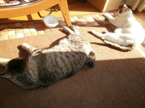 お天気の日の日当たりのいいお部屋は気持ちいいにゃ!・・・でも半分カーテンが閉まっているのでいい場所をとりあいっこです。ん~やはりマロンちゃん(14.5歳♀)の勝ちのモヨウ。その場所、譲ってほしいの~(ちびたん♂)ぜったい譲らない~!!(マロン)