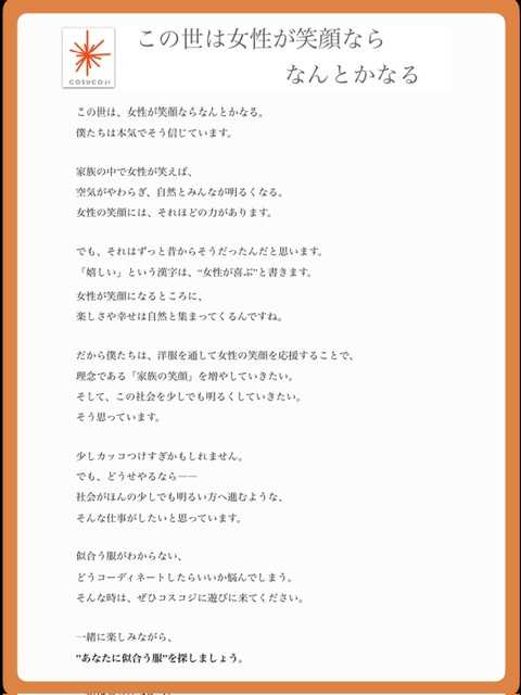 子供服が大好きで、イヤ、本音を言えば子供が産まれて子供たちが大好きになって独立の時に子供服屋になろうと決めました。そして僕の20代の精神的な病気と妻の産後鬱のような状況から、「家族」のありがたみや素晴らしさを実感し、「家族の笑顔のきっかけづくり」と言う理念を掲げてスタートしたのがコスコジです。今でも鮮明に覚えているのですが、創業して1年ぐらい経った時、お客さんにこう言われたのです。「本当に笑顔が必要な人はこのお店には来れない」と。それを聞いて僕はとても残念な気持ちになりました。 あなたの店は届いていないという批判にも聞こえてしまい、僕は今、笑顔でいる人をさらに笑顔にしていただけなんじゃないかなって。 そう思ってしまったからです。だけど、その時にたまたま横にいてそれを聞いていた方が、後で言ってくれたんです。 「大丈夫、ここで生まれた笑顔は伝染する。伝染して必ず必要なところに届く」と。 僕はそれを聞いて救われたれたような気持ちになりました。 そして、僕らがやっていることは間違ってない。 そう思えたんです。笑顔を取り戻すほどの余裕がない人たちが世の中にたくさんいるという現実は確かにあると思います。ここで「うちはうち」「届かない人は仕方ない」と諦める事はできたと思う。でも僕らはそれではイヤだと思いました。改めて理念を問い直して自分たちを再定義したかった。僕らは風が吹けば吹き飛ぶほどの小さな会社です。でもこの街や社会に与えられる何かをきっと持ってる。そう信じて今日もお店を開けます。