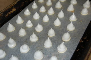 マカロンは作りかたも簡単だし 配合もシンプル そしてとっても オ・イ・シ・イ♪♪♪ 配合 卵白 卵2個分 グラニュー糖100グラム パウダーシュガー100グラム アーモンドプードル160グラム 作りかた ・卵白をたてます・・・お角がたつくらいね。 (湯せんしながらたてるのがコツ♪) ・卵白がたったらグラニューとパウダーシュガー を3回にわけていれながらたて続ける。 ・しっかりたったらアーモンドプードルをいれて 混ぜあわせて絞り袋にいれて絞りだす。 ・オーブンの温度は100度の低温で1時間くらいいれる。 (焼くというより乾燥させるという感じです) * アーモンドプードルにきざみココナッツ(ココナッツロング) や胡桃をミックスしてもいいですよ。160グラムより少なく しちゃうと生地がやわらかすぎて平たくなっちゃいますよ! * 家庭用のオーブンは庫内がせまくて長時間いれても 水分がなかなかとびません。 だから焼く前に2、30分ほど室内において乾燥させる とよいです。 焼く時間も1時間にとらわれずに様子をみて 臨機応変にね! * * マムはこのマカロンの上にメレンゲをのっけて 七人の小人の帽子にしちゃうわけです。 * 卵黄はどうすんの? と、お思いの諸氏! もちろん、カスタードクリームを作ります。 黄身2個、砂糖45グラム、ハート30グラム 牛乳80グラム、水160グラム、バニラオイル少々 この配合ではとてもシンプルな味のカスタード クリームができあがります。 17才になったグ~ちゃんです!