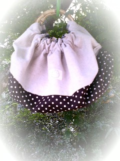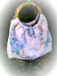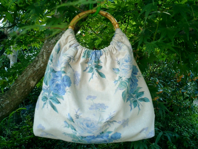 竹製持ち手 素材;綿麻生地 裏地;小花コットン 綿レース ロゴテープ約60×50cmの布を使用して、見掛けよりも、たっぷり収納出来ます。布製なので軽量です。一枚の四角い布を竹製リングに取り付けることで、まあ~るい可愛い形になります。 バックスタイルはロゴテープ入り