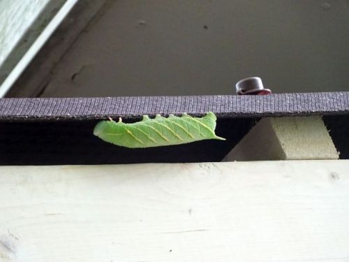 夏に造った勝手口の屋根のところに大きなイモムシが居ました。8㎝程でしょうか?大きなイモムシです。調べてみるとどうやらスズメ蛾、トビイロスズメの幼虫のようです。成虫は確かに夏のクワガタ探しの時にもよく見かけますね。人気ブログランキング 国内旅行ランキング、119位にアップ、有難う御座います。