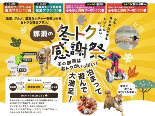 「那須の冬トク感謝祭」開催。冬の那須はお得がいっぱい!泊まって遊んで大満足。3つの企画が用意されています。開催期間:2025年12月1日~2026年2月28日◆企画1:じゃらんnet上にて宿泊クーポンの配布 ・【那須の冬トク感謝祭】 【那須ちびっ子ワールド】2つの共通のキーワードを用いたプランを販売、予約時に該当プランでのみ利用可能な宿泊クーポンを発行します。(その他クーポンとの併用可)注:宿泊クーポンは予約前に取得頂き、予約時に対象クーポンを選択下さい。・予約の最低金額5000円~:クーポン額1,000円、10,000円~:2,000円、30,000円~:3,000円の3券種。・プラン販売期間:2025年10月~2026年2月末アンティークの宿泊プラン【那須の冬トク感謝祭】クリスマスデコレーションケーキとプレゼント付1泊朝食付クリスマスカップルプラン 洋室ラグジュアリーダブル、洋室プチスィートダブル、洋室【那須の冬トク感謝祭】雪景色満喫★自慢の欧風卵料理★1泊朝食付カップルプラン 洋室ラグジュアリーダブル、洋室プチスィートダブル、洋室【那須の冬トク感謝祭】雪景色満喫★自慢の欧風卵料理★1泊朝食付プラン 洋室、洋室DX◆企画2:那須ちびっ子ワールド・フリーパス券• 小学生以下の子供限定で、「那須エリアのレジャー施設大集合、お子様限定、2日間いつでも、どこでも、何度でも、那須フリーパス券」をリリースし、プラン予約者様に対して宿泊施設にて配付致します。• 有効期限は那須エリアに宿泊する当日と翌日の2日間のみ。チケット持参で、いつでも(宿泊当日と翌日のみ)・どこでも(参画施設のみ)・何度でも、入園・入場または体験を可能とします。アンティークの宿泊プラン【那須ちびっ子ワールド】冬季限定!雪景色満喫★1泊朝食付ファミリープラン 洋室、和洋室ダブル、洋室DXフリーパス券利用可能レジャー施設とフリーパス特典内容(小学生以下の子供):那須クラシックカー博物館、入場料600円無料那須サファリパーク、入園料1,900円無料那須どうぶつ王国、入国料12月14日まで(通常営業)1,200円無料、12月15日から(冬季営業):1,000円無料那須とりっくあーとぴあ、単館入館券800円、2館共通券1,400円、3館共通券1,900円 無料※同伴の大人の方も窓口料金から200円引き那須ハイランドパーク、入園料800円無料 ※ファンタジーパス(乗り放題)は別途料金那須ワールドモンキーパーク、入園料1,200円無料ジャイロライドパーク、体験料大人1名様の体験につき、森林オフロードコース30分プラン(定価:5,800円)がお子様1名様まで無料那須フィッシュランド、尾数釣り場エリアZEROでのえさ、竿代無料(500円)(1人1回 まで)※魚代、調理代は別途有料(魚代1尾500円 調理代1尾250円~)フィンランドの森、本物のサンタクロース執務室見学体験無料!※モルック体験(60分間1,500円)、釣り堀(60分間1,000円)、妖精トントゥ作り(500円~)半額◆企画3:じゃらんnet上にて遊び・体験クーポンの配布• じゃらん遊び体験にて、レジャー施設・体験施設等の体験予約に使えるクーポンを発行いたします。• 予約の最低金額1,000円~:クーポン額500円、2,000円~:1,000円の2券種を発行。詳細はこちらこの冬は是非、那須高原へお越しください。人気ブログランキング 国内旅行ランキング、75位、応援お願いします。