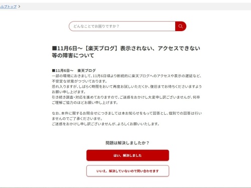11月6日より楽天ブログが繋がりにくい状態が続いていました。それでも11月7日の朝に何とか投稿が出来ました。しかしその後、管理画面にも入れない状態が続いていました。楽天ブログに障害が発生していたようです。本日、久しぶりに管理画面に入ることが出来ました。やっと楽天ブログが復活したようです。日記記入率はちょっと下がってしまいましたが、取り敢えず一安心です。人気ブログランキング 国内旅行ランキング、77位にダウン、応援お願いします。