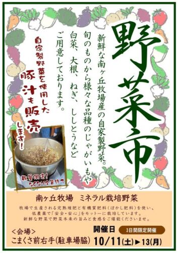 南ヶ丘牧場で野菜市が開催されます。新鮮な南ヶ丘牧場産の自家製野菜。旬のものから様々な品種のじゃがいもや白菜、大根、ねぎ、ししとう等が用意されています。自家製野菜を使用した豚汁も販売されます。開催日:10月11日~13日会場:こまくさ前右手(駐車場脇)詳細はこちらまた、10月の土日祝と10/31(金)は南ヶ丘牧場の動物たち(めぇ~めぇ~広場内の羊・ヤギ、乗ロバのロバ)がハロウィンコスチュームでお迎えします。南ヶ丘牧場はアンティークから車で3分、自転車で5分、走って10分ですよ。是非、行ってみて下さい。人気ブログランキング 国内旅行ランキング、68位にアップ、有難う御座います。