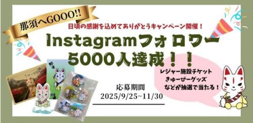 那須町観光協会の公式Instagram「nasu_amazing_naw」のフォロワーが5,000人達成。これを記念して「ありがとうキャンペーン」が開催されます。公式Instagramをフォローし、所定のキーワードを添えて投稿すると2種類のプレゼントのどちらかが抽選でもらえます。プレゼント:1.オリジナルきゅーびーグッズ&きゅーびー直筆サイン、または2.レジャー施設チケットやお土産セット応募方法:1.公式Instagramフォロー、2.那須で撮影した写真または動画を投稿※フィード投稿でお願いいたします。ストーリー投稿は集計できませんので応募条件からは外れます。キーワード:#那須へGOOO と、 #○○○○(訪れた那須の場所名)を付けて投稿応募期間:2025年9月25日(木)~2025年11月30日(日)公式Instagramはこちら詳細はこちら皆さんも是非、投稿してプレゼントをもらって下さい。人気ブログランキング 国内旅行ランキング、71位にアップ、有難う御座います。