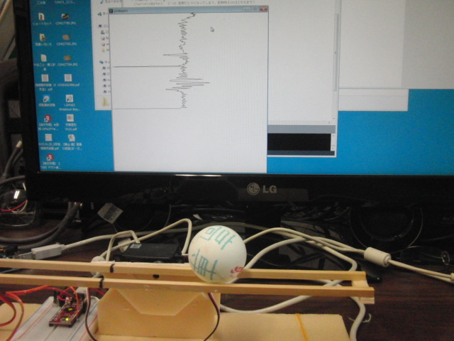 制御工学がご専門のO先生にデータをグラフに表示できたらいいねって言われたので,シリアル通信でデータを出力して,プロセッシングで表示させてみました.距離をグラフ化してます.センサの特性でかなりのノイズが乗ってることがわかります.センサのノイズ除去を上手くやらないとピタっと止まらないことが理解できます.
