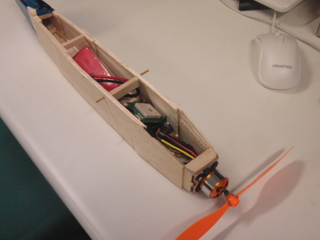 頭にあると気になってしまうので,いっきに製作.勘が鈍ってて,重心を合わせるために機体の長さを3度作り直しました.電池なしで重心がちょっと前より.電池を積む位置で重心を適当に調整できます.GPSの部分に窓を開けました.あと,アンプ冷却のための空気穴も必要ですね.350-400クラス相当のブラシレスモータとLipo1900mAhを載せて,389g.フィルムを貼って,ケーブルを配線して,450g以内にはおさまりそうです.--追記--フィルム貼った.アンプつないでモーターを回してみた.スロットル2/3で5Aくらいで結構引っぱる.3Aくらいでレベルキープ位か.20分くらいは飛んで欲しい.