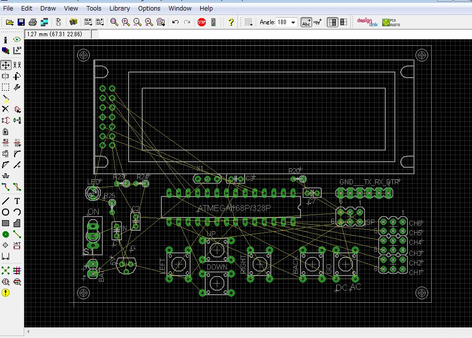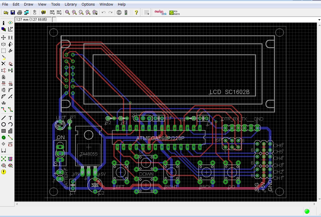 こんな感じで基板作成中.AVRマイコンのアナログポート6ch(デジタル使用可)を引き出して,スイッチでメニューを選んで,いろいろ接続したものの計測結果をLCDに表示させるもの.