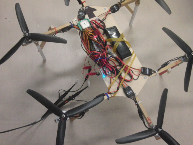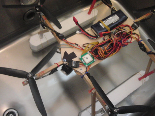 以前作ったクアッドコプターですが,飛ばしたいものが重すぎて飛ばなかったのでヘキサコプターに作り替えてみました.形ができたところで一息,設定はこれから.クアッドからの改造なので,クロスにしていた2本の木の棒をそのまま利用できるように考えました.プロペラのサイズの制約から対象な6角形にはできなかったので縦長のクロス型のヘキサコプターにしました.クアッドコプターは飛ばしているうちに方向を見失って危険なことがあったので,この形の方が前後がはっきり認識できるんじゃないかと思います.カメラを積んだりするときも前後でアンバランスになりやすいので,この形の方が安定が良くなるんじゃないかと思います.上手く飛ぶかな?--追記--調整したらヘキサコプター浮いたけど1つだけアンプの調子が悪い?一度回すとまわりっぱなしで止まらない.アンプのプログラムカードでリセットして送信機の上下をセットしてみてもだめ.画面上ではAPMからは正常な信号が出てる.アンプを変えてみるか?