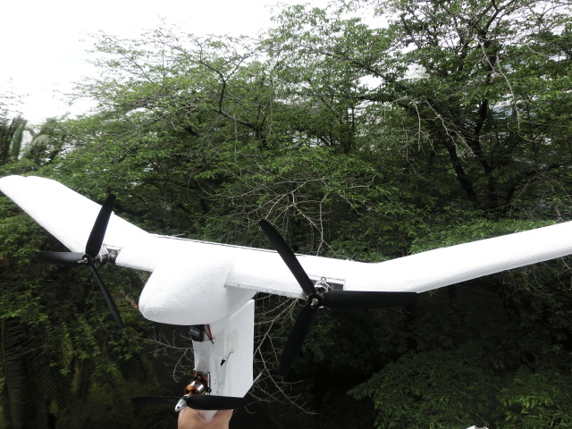 前に紹介したVTOLの2号機を作りました。以前の記事はこちら→トライコプターをもとにした垂直離着陸機(VTOL) 動画はこちら、VTOL, modified Tricopter 発泡スチロールを切り出して整形して、竹を曲げたのカンザシを入れて翼端を着脱式に。空気抵抗を少なくするためにヘッドを削りだし、カーボンロッドを入れて補強、基本パーツの製作完了。組み立てたところ。メカ積みして完成!ROBOMEC2015にて展示します。