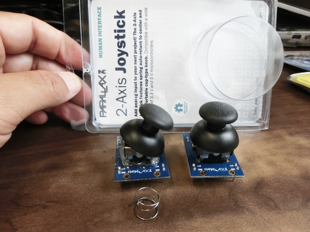 秋月さんから購入した2軸ジョイスティックは、結構強いバネが入って、中立の位置に戻ります。http://akizukidenshi.com/catalog/g/gM-06807/バネを取り外してフリーにして使いたかったので、分解して改造。裏の半田が上手く撮れなかったの固定の金属をカットして取り外し、分解、バネを取り出し、最組み立てして、カットした部分はしょうがないので、ホットボンドで固定。写真のようにフリーで使えるようになりました。何に使うかはお楽しみ。
