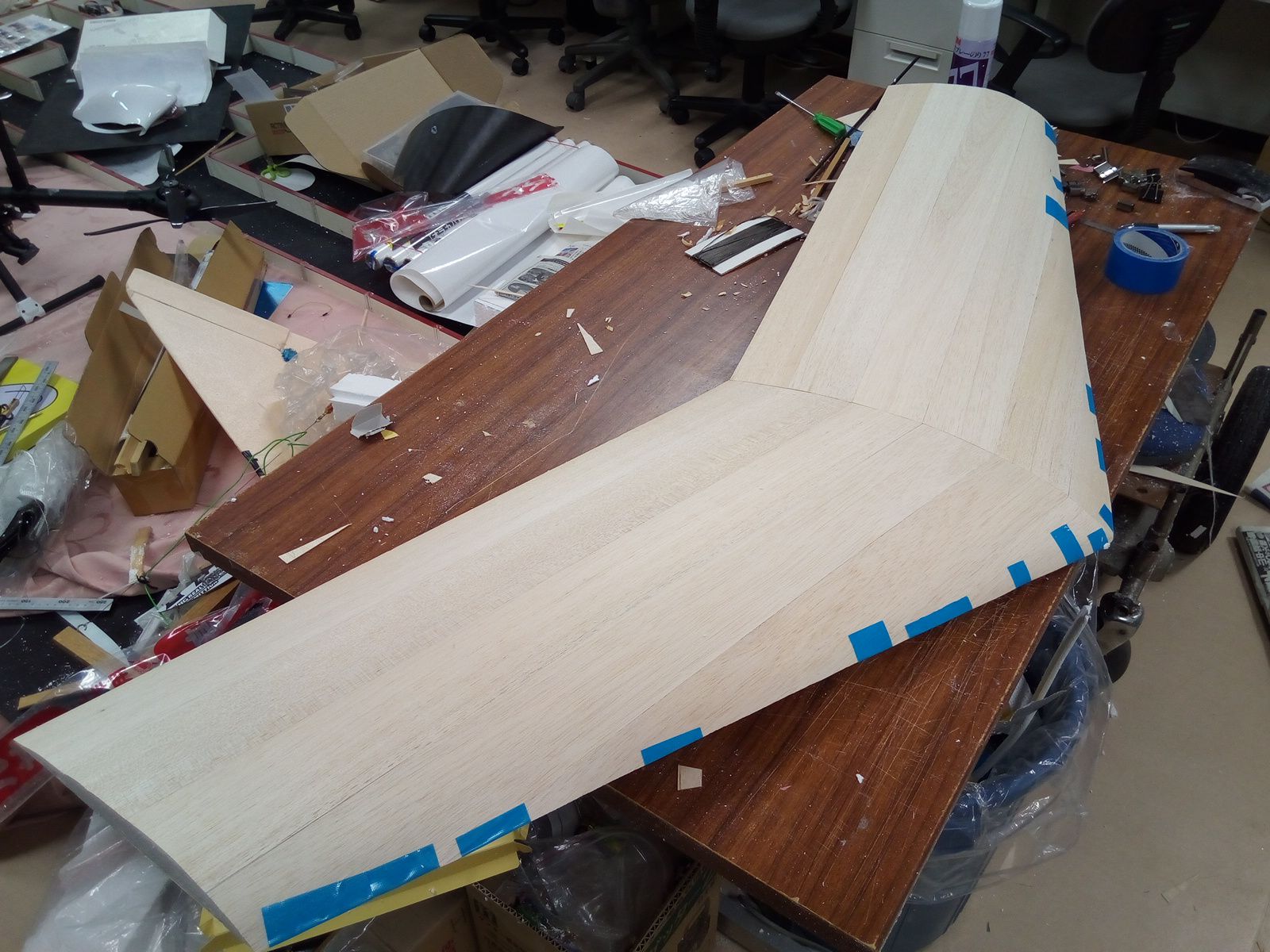 次に表面の湾曲に沿ってバルサを貼り付け.湾曲の大きいところは養生テープで乾くまで補強.