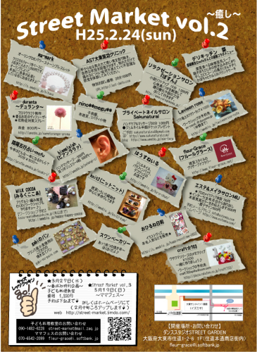 2月20日(水曜日)この先週末は、材料調達で走り回っていましたこれからイベント参加も多くなりますし、準備万端ですっさてさて、色々なお店に走り回りながらも、新作作ってみました色々ありますので、次回ブログでご紹介させていただきます!!これから紹介する作品は、全て 2月24日(日曜日)に開催されます、street market イベントで販売致します住道商店街内 11時~16時 fleur-Grace様主催 販売&体験レッスンします!場内の配置図です! ☆新作☆ちょっとチラ見せです! お楽しみに