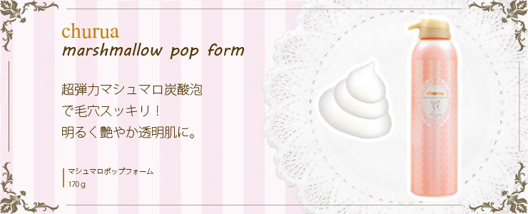 忙しい人におススメ!押すだけで濃密な泡。毎日ネットで泡立ててからの洗顔って、ちょっと面倒くさい。その上、濃密な泡なんてやっぱり無理...。と思って使ってみた【マシュマロポップフォーム】。これならぷしゅっと押すだけでこっくりもっちもち泡が出てくるのでひと手間が省けとってもラク!しかもしっかり汚れを吸着してくれそうな弾力。本当にマシュマロみたい。炭酸が含まれているので、泡を肌に乗せるとプチプチと弾ける感覚と共にじわ~っと温かくなり、血流がよくなっていく感じがします。シミ・くすみの原因となるメラニンを含む古い角質を取り除くマシュマロポップフォームのPOINT1. 炭酸のチカラで古い角質をオフ。プチプチと弾ける小さい炭酸の泡が、シミ・くすみの原因となるメラニンを含む古い角質を優しく取り除き、明るく艶やかな透明肌へと導きます。2. 美容成分配合で、洗い上がりはしっとり・すべすべに。自然界最強の抗酸化力といわれているピュアアスタキサンチンをはじめ、EGFのように肌再生を助ける4つのペプチド、ハチミツ、ローヤルゼリーエキス、コエンザイムQ10、αリポ酸、ビタミンC誘導体、ヒアルロン酸などお肌に嬉しい成分がたっぷり配合されています。3. 手に取ってすぐに使える。泡立て不要!手に取ってすぐに使えるので、時間をムダにしたくない主婦やOLの方にも好評です。容量は170gグラム。定価3200円。朝・夜の洗顔で約1ヶ月分となっています。この容量でコスパ的には、やや高いかも。と思いましたが定価以下で売られているショップも結構ありました。※炭酸の刺激がお肌の弱い人には強く感じられるかもしれません。パックをする際はお肌に乗せる時間を短めにされるといいと思います。