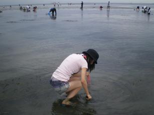 前々から、行きたかった潮干狩りに行ってきましたここのところ、週末になると天気が悪く、この日の朝も玄関を出た瞬間にポツポツ・・と雨オンナなのは、自覚してるんですけど今年の目標は晴れオンナになる!!って決めたのに!!(特に何の対策もありませんが・・・)おかしい。。病は気から的な発想で、私は晴れオンナって思うようにしてるのに。。お出かけしようと思うと雨が降る~。ナンで?干ばつで苦しんでいる国へ行けば、私は崇め奉られる?女神?ポワワワ~ン(妄想中・・・)よーちゃんを探すなら、雨雲の下を探せ!って言ったアキちゃん!超~名言だよぉ~~!(・・感心してる場合じゃないか)ま、自他共に認める雨オンナであることには間違いない。サーフィンだって雨の中やってる人がいるし、潮干狩りだって、どうせ濡れるし、雨でもいーじゃん!ってことで、小雨がぱらつく中、知多半島の西に隣接している坂井海岸に行ってまいりましたこの日の為に、Tシャツとホットパンツを買ったんだ♪駐車場でおじさんが1300円と引き換えにネットをくれました。この中に入る分だけ持って帰っていいってことらしい・・。干潮が12時と聞いていたのに、11時の時点で水が上がってきていて、熊手(ガリガリするやつ)なしでは掘れなかったよ。うちのパパさんこと、けんきっちゃん(釣り吉でもあります)が潮干狩り好きなので(しょっちゅう一人で行くし)、いろいろとグッズを借りていって良かったよ。 ありがとーけんきっつぁん! ガリガリ。ガリガリ。何にもないとこには何にもないんだよね~ ガリガリ。ガリガリガリガリ。うーん、この海、貝いないよガリリッ!ガリリリリッ!!ワォ♪♪こんな採れた! あるとこにはゴロゴロしてるんだよ。ガリリッと感触あったところを、熊手でかき集めておいて、両手ですくって、ザルで金を振るいにかけるように取ったよ。水があったので、しゃがむとホットパンツでさえも裾が塗れちゃったし、腰が痛くなっちゃった中腰でしゃがんでるのってきつくて、四つんばいで膝付いて首にタオル巻きながら必死にやってたら、いっぱ~ぃ取れたよさて、採れたてのあさりちゃんたちは海水で一晩砂抜きして、明日の夜に酒蒸しにするつもりです~。ワクワク帰りに恋の水神社に寄ってきました。今年初めてのおむくじ。なんと、大吉だった!! 待ち人・・・3年連続、遅けれど来る。。だったけど。(去年ごろから、おっせーよ!って悪態ついて、神さまごめんなさい)今年は、待ち人・・・来るかな~