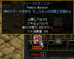 あうっ!先日は、カンスト日記へ、たくさんの暖かい祝福のメッセージ、本当にありがとうございました(m´・ω・`)m みなさんのおかげで、ここまで辿り着けたと思っております・゜・(つД`)・゜・ さて、125歳になったら試してみたい事がありまして・・・。タイトルの通り、フィーブルモンスターをMAXにしてみました。すごいですね、ダメージ90%ダウンだそうです。ただ、フィーブルMAXにしてしまうと、ご覧のように残りポイントが29ポイントになってしまうため、ステ、スキル振りの調節が難しいのかな、と感じました。この90%ダウン、モンスターの攻撃にのみ有効なようで・・・。グラでユニメンのみなさんと検証してみたところ、対人では30%くらいのダウンにしかなりませんでした(´・ω・`)ショボーン現在、死にスキルとなってしまっている フィーブルモンスター ですが、うまく使いどころによっては驚異的なスキルとなるのではないかと感じた今日この頃です。(対モンスさあ、他にもアレコレやってみようかと思っていましたが、マンドクサイので・・・。今晩転生したいと思います!!