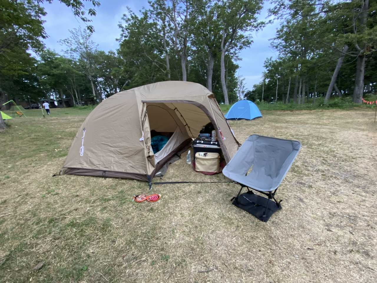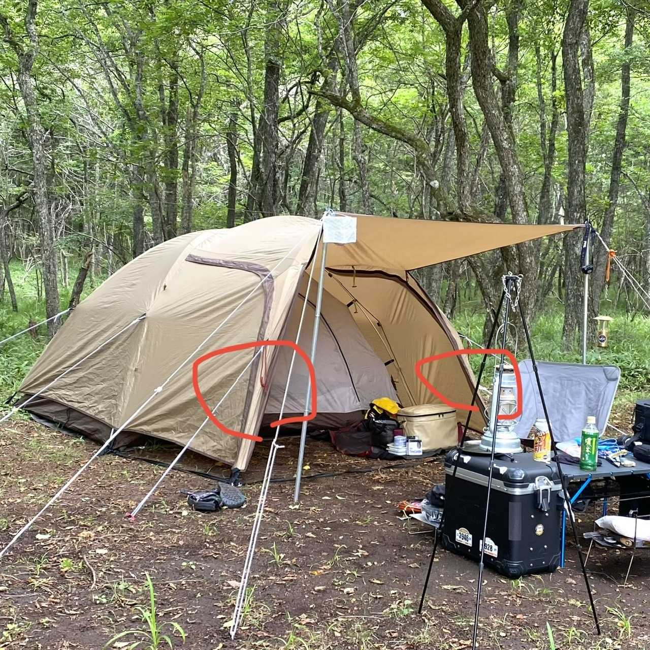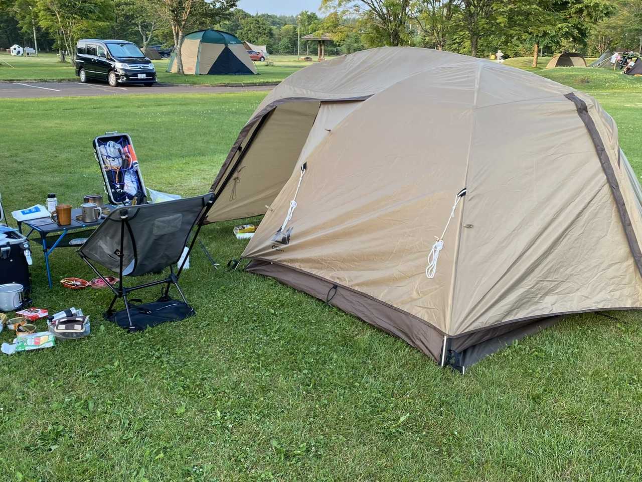 今年の北海道での宿⁉️は、やはり定番のオガワのステイシーで行きます🏕️設営が簡単ですし、前室が広いので雨天時でもターフ要らずな為私の一軍です。荷物が限定されるバイクのツーリングにおいては、最高のテントだと思います。私にとって今のステイシーは、2代目で初代は加水分解や雨漏りするまで使い倒し、2代目を購入しました👍このステイシーを少しでも早く設営できるような2つの工夫をしています😊まず一つ目は、テントフロアとグランドシートを連結してます。これは、私が持っているもう一つのテント『ヒルバーグ』のテントを参考にただ単に『タイラップで連携しているだけ』です🧐2つ目は、メインの入り口がすぐわかるように入り口の柱⁉️に、赤いループをそれぞれ左右に結んでます。これが効果絶大で、今までフライシートを被せる時に正面を間違えていたのが嘘みたいに1発で設営できるようになりました❣️ (歪な赤丸⁉️ 赤いループを左右に付けている)以上の2点を工夫し、これから説明する設営方法にするだけで驚くほど設営が早くなります😊①グラウンドシートがセットされたテント本体を希望の場所に広げる②テント本体の入り口の反対側左右2ヶ所をペグダウン (入り口側は、前室用の黒いテープがある)③ハトメにポール両端を差し込む (ペグダウンしていないとテント本体が動いたり、ハトメから先端が外れたりする)④ポールにテント本体をぶら下げる⑤正面を確認しながら、フライシードをかぶせる⑥後は、各所を整えておしまい!この方法にしてから本当に設営が早くなりました😊さらに、設営が終わったら前回のブログでお話しした左側のドライバッグをテントの中に放り込み、中で広げるだけです👌ちなみに撤収は、テントの中のものは上記ドライバッグに詰め込み、テント本体は右側用のドライバックに適当に入れるだけなので撤収も最速‼️です👌