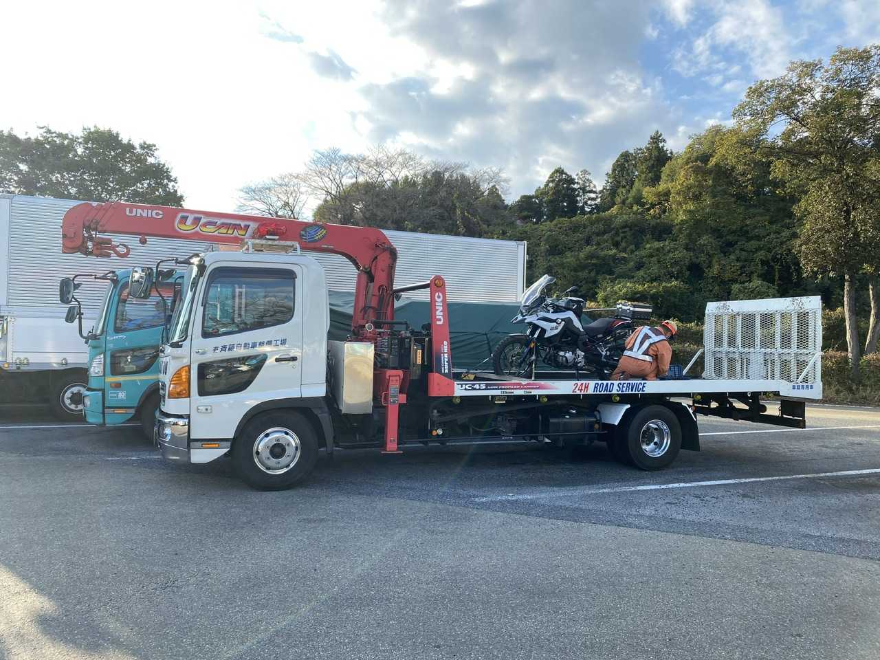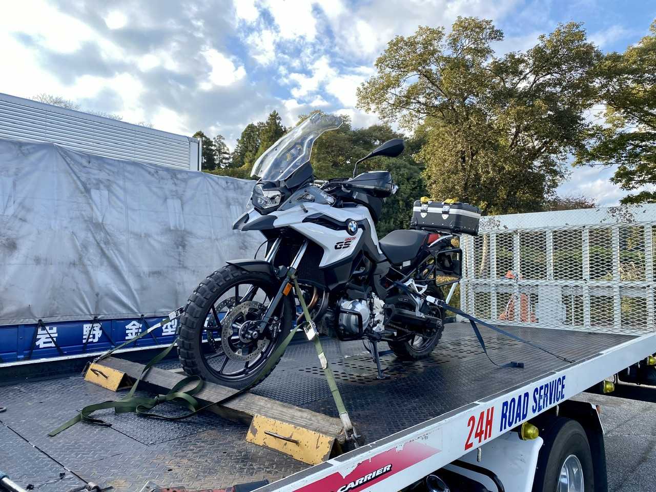 JAFが来て、開口一番。バイクのタイヤは楕円形だからパンク修理しないほうが良いよ🧐パンク修理する場合は、自己責任だからね、と言われたので仕方がないのでレッカーで東京のお店まで運んでもらうことに😱