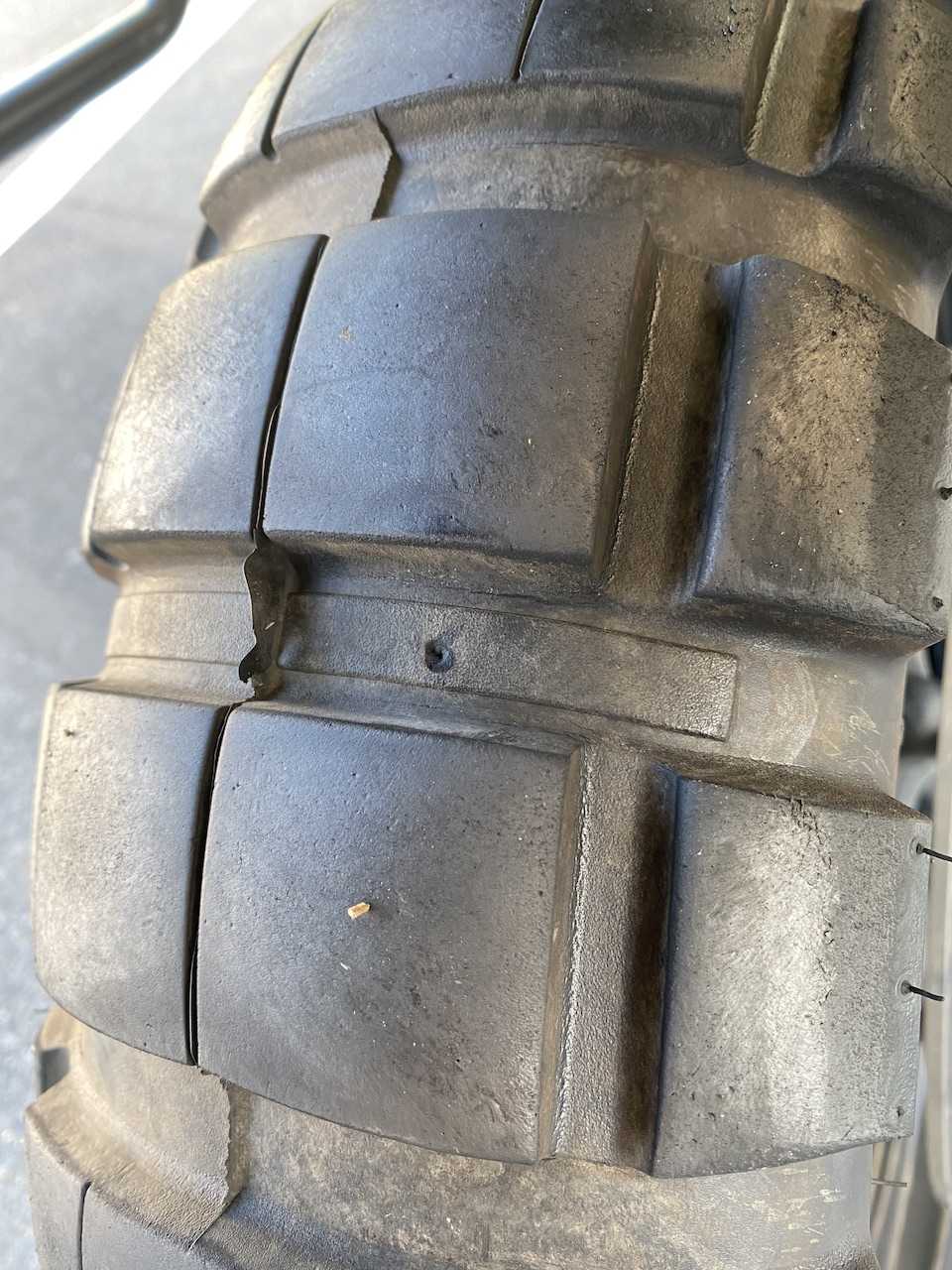 恐らく釘が刺さっていたが、その釘も抜けて虚しく映るリヤタイヤ😰😰とパンクした穴😂😂
