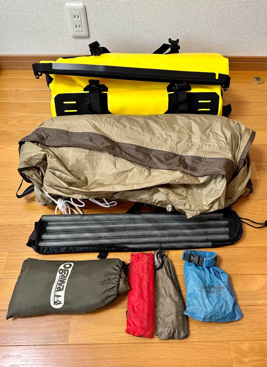 テント ステイシー(オガワ)、グラウンドシート(この時はまだテントフロアに連結する前)、跳ね上げ用ポール、ペグ、ロープ