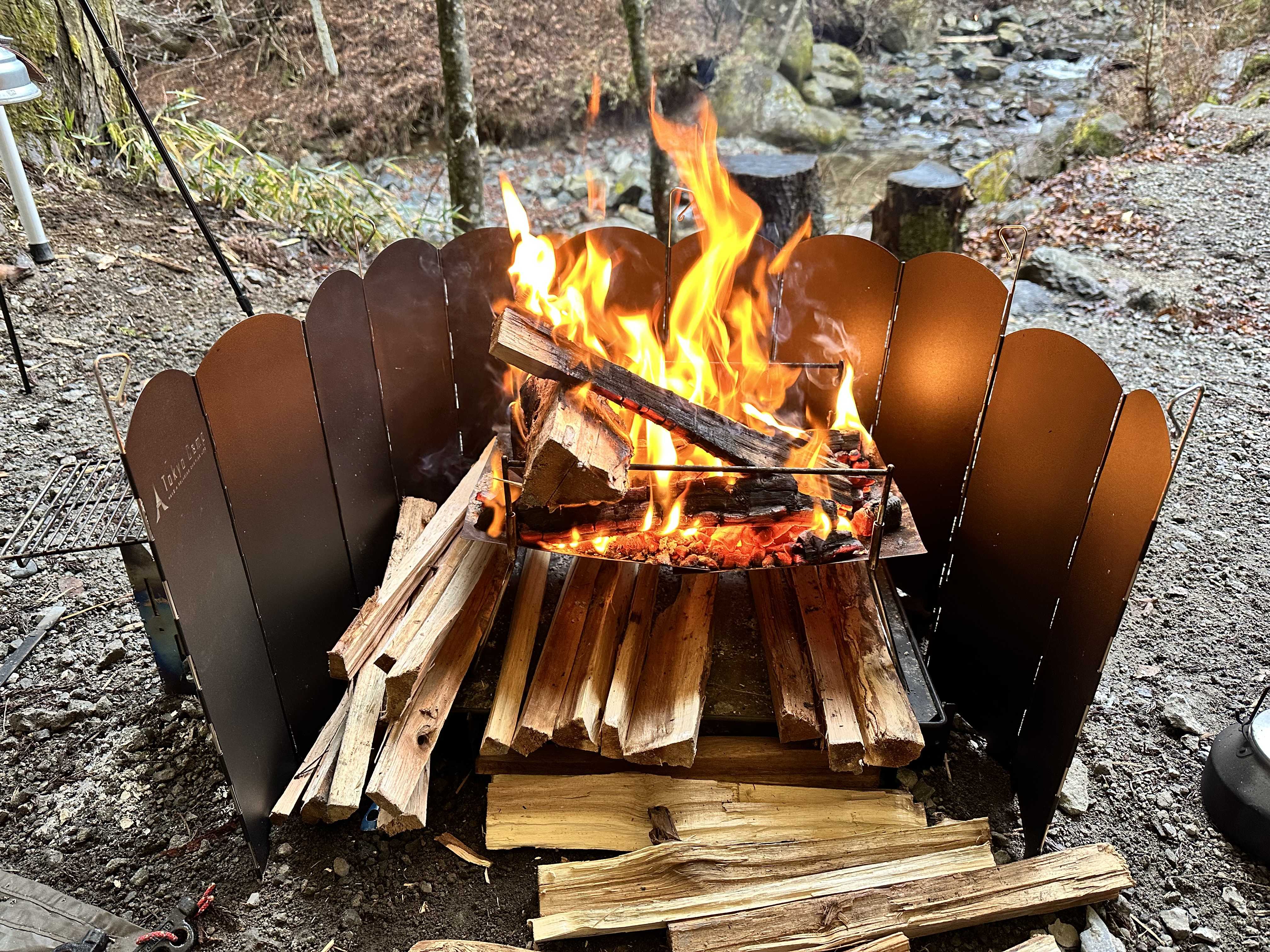 本当は夜のキャンプ場でこのランタンの光と焚き火
