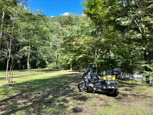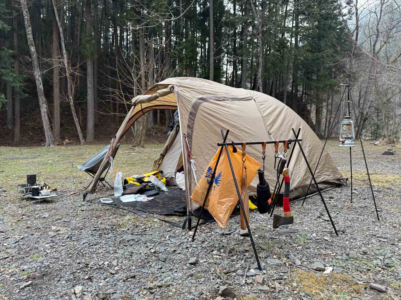 よくよく考えてみると最後が23年10月なので、約1年半ぶりのキャンプツーリングです🏕️準備の段階では久しぶり感⁈があり、困った時用の過去の積載写真を見ながら準備しました👍(詳しくは23年6月の北海道の装備をご覧ください)またバイクが動き出してからの挙動ですが、たくさんキャンプ道具を積んでるので、いつもと違います。当然ブレーキも。最初の30分くらいは注意深く運転します。鬼門は、停止する瞬間です🧐バイクは走っている時(トルクがかかっている時)は、安定してますが、トルクの抜けた停止直前が一番不安定だと思います。1時間くらい走り、買い出しのスーパーに立ち寄り・買い物をしました。お酒や食べ物が加わり、さらに積載量が増えました😰1時間ほど走ると、キャンプ場到着です😊先客は1組。管理人さんがすぐに来てくれて、今日は我々と先客の2組と教えてくれました。テント設営後、私は1時間ほど釣りに出かけました🎣川はいつもより水位が高く,流れも速かったです。フライフィッシングの初心者🔰のため、そんな状態でうまく毛鉤を流せずボウズに終わりました。(ルアー持ってくれば良かった…)戻ってからは、お楽しみの焚き火🔥&焼肉です♪