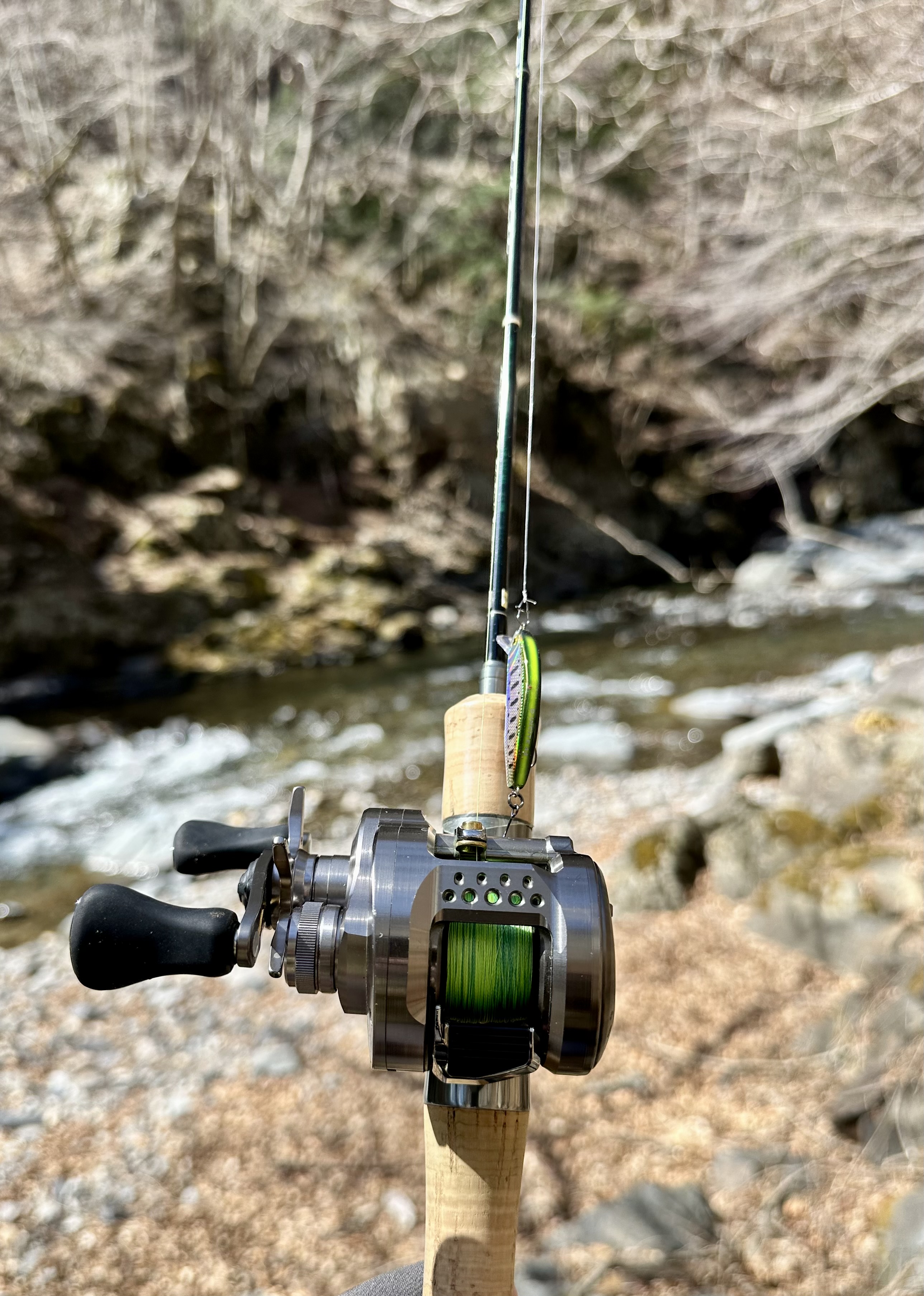 シーズン終了後から、師匠に相談し始めました。タックルは、昔ブラックバスをやっていた時はベイトを使ってました。どうもスピニングだと加減がわからずうまく投げれません。そして、実は師匠の使っているカルカッタに一目惚れしてました🤩実家の近くの釣具のスタッフも私や師匠と同じ価値観で、良いものを長く使うタイプの人でした。その人からは、竿はクセのないテンリュウをオススメされました。結局、竿は、テンリュウ(RZ4102B-UL)リールは、シマノの23カルカッタコンクエストBFSを、購入しました。(んっ!スピニングセット買ったばかりじぁなかったっけ😜)そのタックルで禁漁時期は管釣りに通い、キャスティング、取り込みを練習し、釣るというフローを体に叩き込みました。そして、2023年解禁です。