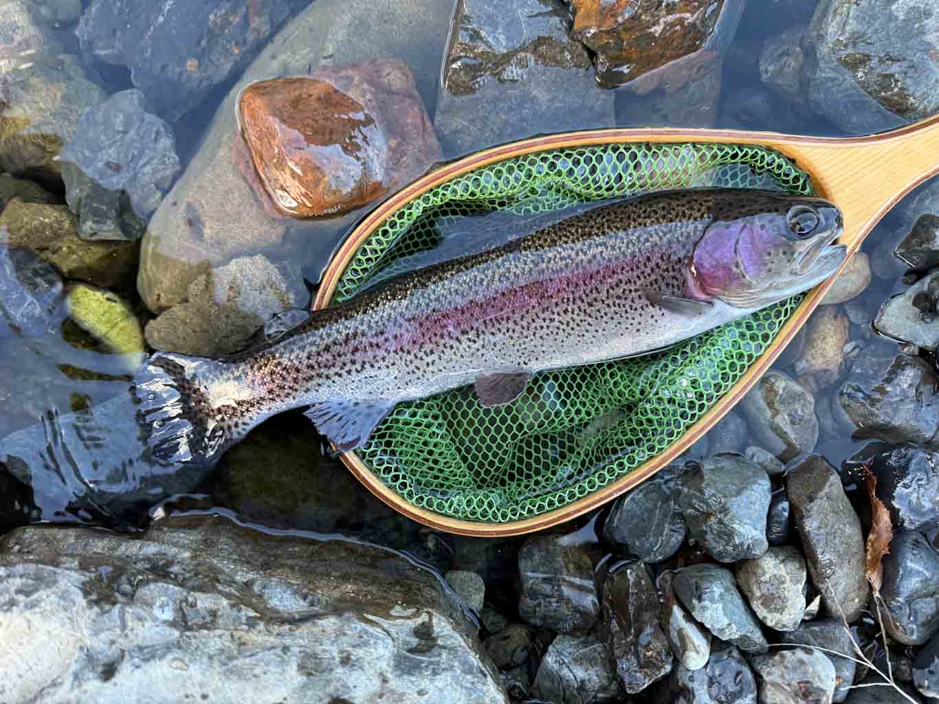 先週解禁前最後の釣りに行ってきました🎣水温は相変わらず上がらず、お昼前で5℃です。今回もまだライズがないので、ニンフの釣りです。水中に見える鱒たちは上流に顔を向け、底にピッタリ張り付いてます。なかなかの低活性だったので、ニンフが顔の前を通過するように意識します。沈み方が遅く、なかなかうまく流れなかったので途中でニンフとインジケーターの間にオモリを追加しました。何回か投げたその時、突然インジケーターが吸い込まれたました‼️これは大きい👍ラインを手繰ったあと、長期戦になると判断してラインをリールに巻取り、初めてのリールファイト🧵マスが走るとドラグを緩め、落ち着くとリールを巻くを何回か繰り返すとついにニジマスは口を水面に出しました🐟あとは、ランディング直前の抵抗、首振り、テンションの緩みに気をつけながらランディング👍尾鰭がちょっと残念ですが、良い引きで楽しませてくれました😊😊さぁ!明日はお待ちかねの解禁日です🎉