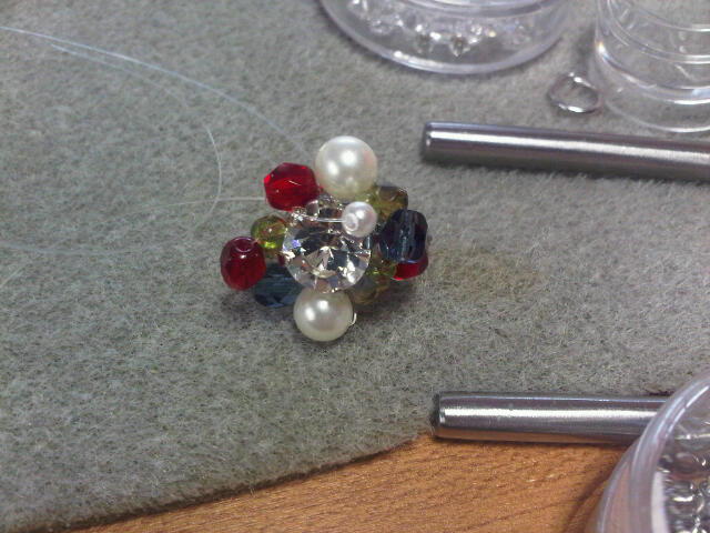 今朝は珍しく早起きをしました。そして、何を思ったのか、いきなりめがね留めを始めてしまい。。。 それがなんと、調子良く、どんどん進みます。 でも、やっぱり寝ぼけていました。通すものを通さずにめがね留め完成させてしまいました。めがね留めは一度やってしまうともう一度開くことはできません。その部分のワイヤーを切ってやり直すしか方法は残されていないのです。切ってしまうので、もちろん一本のワイヤーで出来ているビーズの反対側のめがね留めも切ってやり直しです。ガビビーン!!きれいな丸が作れた箇所に限ってやり直し。。。 でもめがね留め大好き。