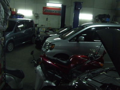 今日は、午後からの入出庫が多いです。最終がPM9:00出庫の予定です。先程まで、車検入庫と板金及び冷却系廻りの整備のお客様と談笑してました。少し時間がありますので、夜のピット風景と、少しショックな出来事をアップします。(笑)仕事が終わり静寂のピットです。クルマたちもお休みなさいの時間です。入庫中のRX-8です。右が前側、左が室内側です。エンジンカバーを外すと、前側はスッカラカンです。室内側に、ロータリーの小さなエンジンをレイアウトし、フロントミッドシップを達成してます。ホントに小さなエンジンです。今回の作業で解ったことですが、冷却水は原液のまま注入するみたいなんです。普通は、LLCの原液を水で薄めて使用しますが、RX-8については、専用LLCをそのまま使用します。特殊ですなぁ~そしてZZRをピットに入れて、エンジンに火を入れたところ。。。なんか漏れてる!!マフラーが破れてました。。。ショック。。。ご丁寧に、左側も。。。(涙)こりゃ、集合菅に換えろ!ってことでしょうか?(爆!)いえいえ修理して使いますよ。週末は溶接作業か。。。(汗)