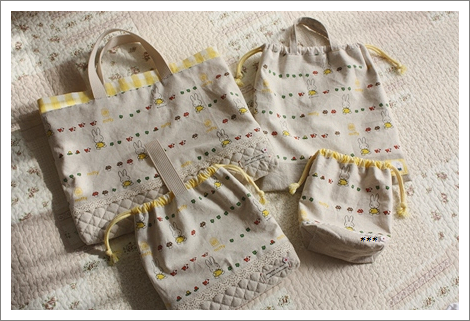 UPするのが遅くなってしまいましたが、、、入園用に私が作った袋物を、少しご紹介したいと思います^^ レッスンバッグ、シューズバッグ、お着替え袋にコップ袋です。画像にはありませんが、他にもナフキンや給食袋も製作しました。 色違いで揃えたかったので、生地はミッフィーちゃんに^^イエローがお姉ちゃん、オレンジが妹ちゃんのものです。 レシピは Studio-Clip さんのものを参考にしました。他にも可愛いレシピが沢山あるので、ぜひのぞいてみてください♪ ・・・ 使用した生地はこちら ・・・ ミッフィーちゃんのイエローはもう完売したのかも? ↑この生地、最高に可愛いですよ~^^今回は裏地に使用しましたが、次はメインで使ってみたいです。お値段もお安いし、とってもオススメ♪ *** ちらっ♪