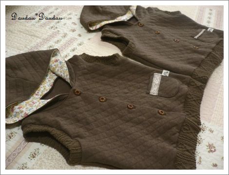 最近、ソーイング熱上がりまくりで爆縫いしています。今度はココア色のキルトニットで、娘たちのフードベストを作りました。 ■ キルトニット : fabric Sachet■ フード内布 : ハナミズキ■ パターン : ヤフオク (xxxxx_kotton_xxxxxさん) こちらのパターンは、アレンジ用にうさ耳のパターンも別に付いていて前回作った ウサ&クマ耳フードベスト もこちらのパターンで製作しています。今回はノーマルフードの方で、90~100サイズの丈を少し伸ばして製作しました。 リブは Wildberry さんの縄編みシャーリングジャガード。ボタンはお花の形をしていて、とっても可愛いんです*^^* 一応、今回も双子らしくちょこっとデザインを変えてポケット部分のレースとタグを違うものに** 実は、今回のソーイングはかなりの不調で何度単純なミスを繰り返し、何度縫い目を解く羽目になったことか。。。><最後まで投げ出さずに頑張って完成させた自分を誉めてやりたい! と思う位です。笑 う~ん。。 何か、春っぽくないかもなぁ~^^;どちらかというと、秋っぽいような・・・?まぁ、手持ちのお洋服に合わせ易いということで良し!! としましょう♪ ランキングに参加しています。 「ぽちっ」 としていただけると、とっても励みになります**↓ ↓ ↓ 送料無料【共同購入】初めてじゃなくても買えちゃいます。ラミーリネン2M2000円! これ、とってもお得ですよね♪以前に購入したことがあって、その在庫ももう僅かになってきているので今、買おうか買わまいかすっごく悩み中です。最近、布買い過ぎてるからなぁ~><