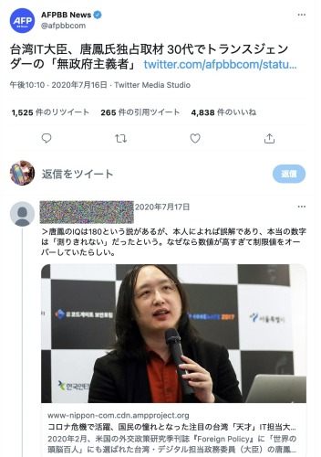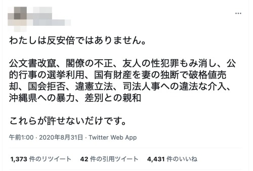 【16日】「皆が死んだのだから、おまえも死ね」水木しげるさんに上官は言った。 https://www.huffingtonpost.jp/entry/mizuki-shigeru_jp_5f37817dc5b6959911e4dd57?ncid=other_twitter_cooo9wqtham&utm_campaign=share_twitter…posted at 12:51:01コロナ禍に迷走する政治家に重なる、責任回避した特攻立案者たちの姿 @gendai_biz https://gendai.ismedia.jp/articles/-/72205 #現代ビジネス「俺は死ぬ係じゃないから」特攻を立案した側の言い放つ言葉がこれ😩一国のソーリ大臣が「責任を取ればよいというものではない」キリッとかやるわけだわ…posted at 16:44:45【17日】コロナかもと思ったらどこで相談・検査?現状をおさらい:朝日新聞デジタル https://www.asahi.com/articles/ASN875T7GN85UTFL00C.html… #新型コロナウイルスposted at 08:30:48【18日】電通の“2年ぶり黒字”に「安倍政権が仕事回した」「血税中抜きで儲けた」のツッコミ! 実際「官公庁・団体」の売上が873億円と倍増 https://lite-ra.com/2020/08/post-5575.html… @litera_webよりposted at 08:57:52【19日】Go To東京除外は「小池都知事にやり返したかっただけ」? 菅官房長官の暴走 https://dot.asahi.com/wa/2020081800052.html… @dot_asahi_pubよりそうだと思ってたよー😗posted at 09:15:10RT https://www.tokyo-np.co.jp/article/49678posted at 20:11:36【20日】小沢氏「憲政上の大きな出来事」 合流に賛成多数を絶賛 https://www.sankei.com/politics/news/200819/plt2008190042-n1.html… @Sankei_newsよりposted at 08:29:44そりゃそうでしょう🤔 posted at 08:51:27ごめん🤣笑っていい? posted at 22:00:24「収賄よりまずい」自民からも厳しい声 秋元司議員逮捕:朝日新聞デジタル https://www.asahi.com/articles/ASN8N6JXZN8NUTIL016.html…posted at 22:01:38【21日】伊藤詩織さん、衆院議員の杉田水脈氏、Daisy大澤昇平社長を提訴。「いいね」押した責任問う | Business Insider Japan https://www.businessinsider.jp/post-218728posted at 00:20:53訴訟の行方に注目したい。ヘイトツイートにつく大量の「いいね」も名誉侵害になるのか🤔posted at 10:09:48芸能人やアスリートなど目立つ人物へむけた悪意あるツイートの発言者のみならず、拡散RTと賛同のいいねをした者も名誉侵害に加担したものとみなされるべき。posted at 10:15:50【22日】コロナワクチン、どれほど期待していいの?専門家に聞く:朝日新聞デジタル https://www.asahi.com/articles/ASN8P6QK4N8PULBJ008.html…posted at 21:55:36【23日】そんな悠長な…😩「不要不急の外出は控えましょう」と言っていた春は何だったの? posted at 13:06:48【25日】異変?潮目が変わった? NHKが「支持率が過去最低」を強調して安倍首相をブラジル大統領と並べて報道!(水島宏明) - Y!ニュース https://news.yahoo.co.jp/byline/mizushimahiroaki/20200825-00194880/…posted at 12:24:36オードリー・タン「日本人は未来に住んでいるようだった」。台湾の天才大臣が語った来日時の記憶 【インタビュー全文:その①】 | ハフポスト https://www.huffingtonpost.jp/entry/audrey-tang-huffpost-live-1_jp_5f3292a2c5b6960c066c87c6…posted at 12:25:42【26日】元通りといっても全く同じになるわけじゃないし、できるだけ元の生活の再現に近い方向で出来る限りのことをするか、全く新しい生活様式を作るか🤔元の生活に固執すると苦しいだろうなぁとは思う。posted at 19:04:23【27日】はあ……座礁したの7月25日ですよ😩 posted at 09:59:41【28日】死ぬまでにもう一度行きたい場所、一度でいいから観たい景色が夢で終わっちゃうのかな。2〜3年は無理でも5年10年後に✈︎行くために体力だけはこれ以上落とさないように頑張るわ。posted at 07:06:15ほんとに不思議な感じ。たった半年前には当たり前にできた事ができなくなって、逆にできるならもっと早くからやればよかった!事を皆が気付いたり(オンライン会議とか清潔な生活習慣とか)😌posted at 07:11:59これはさすがに容認できない。「副反応による健康被害が出ても製薬会社は責任取らなくていいよ」🤔せめて補償がなきゃ怖くて💉打てません…https://twitter.com/asahi/status/1298920702725066752…posted at 07:32:16サクッとPCR検査を受けて迅速に判定される重要性を芸能人が証明してくれましたね。判定では陰性でも疑わしき症状があるなら再検査すべきであることも。posted at 09:05:59一般人がなかなか検査にたどり着けないのは公費をケチりたいからかな…自費ならサクッと受けられるみたいだし🤔差別じゃん。posted at 09:09:10辞任してもこれまでの疑惑はチャラになりませんからね‼️posted at 15:02:30RT 正直なところ貧乏くじを引かされる気分だと思う。 posted at 15:06:36憲法改正は無理、この分だとオリンピックも開催も無理っぽい。ならばせめて歴代最長記録だけでも更新するために国会も開かずこもって引き延ばしてたのかな。よかったですね記録に残って。posted at 15:18:26自民党も安倍さんも嫌いだけど下品な言葉で持病を揶揄したり◯ねばいいのにとか言う人も嫌いだよ。posted at 18:48:01次の総理は7年8ヶ月の間に日本で当たり前になってしまった公文書改ざんや隠蔽を許さず、閣議決定より議会での討議を大事にする人に。あと何より税金を正しく使える人!🇺🇸様やお仲間お友達への利権還元より日本国民の生活優