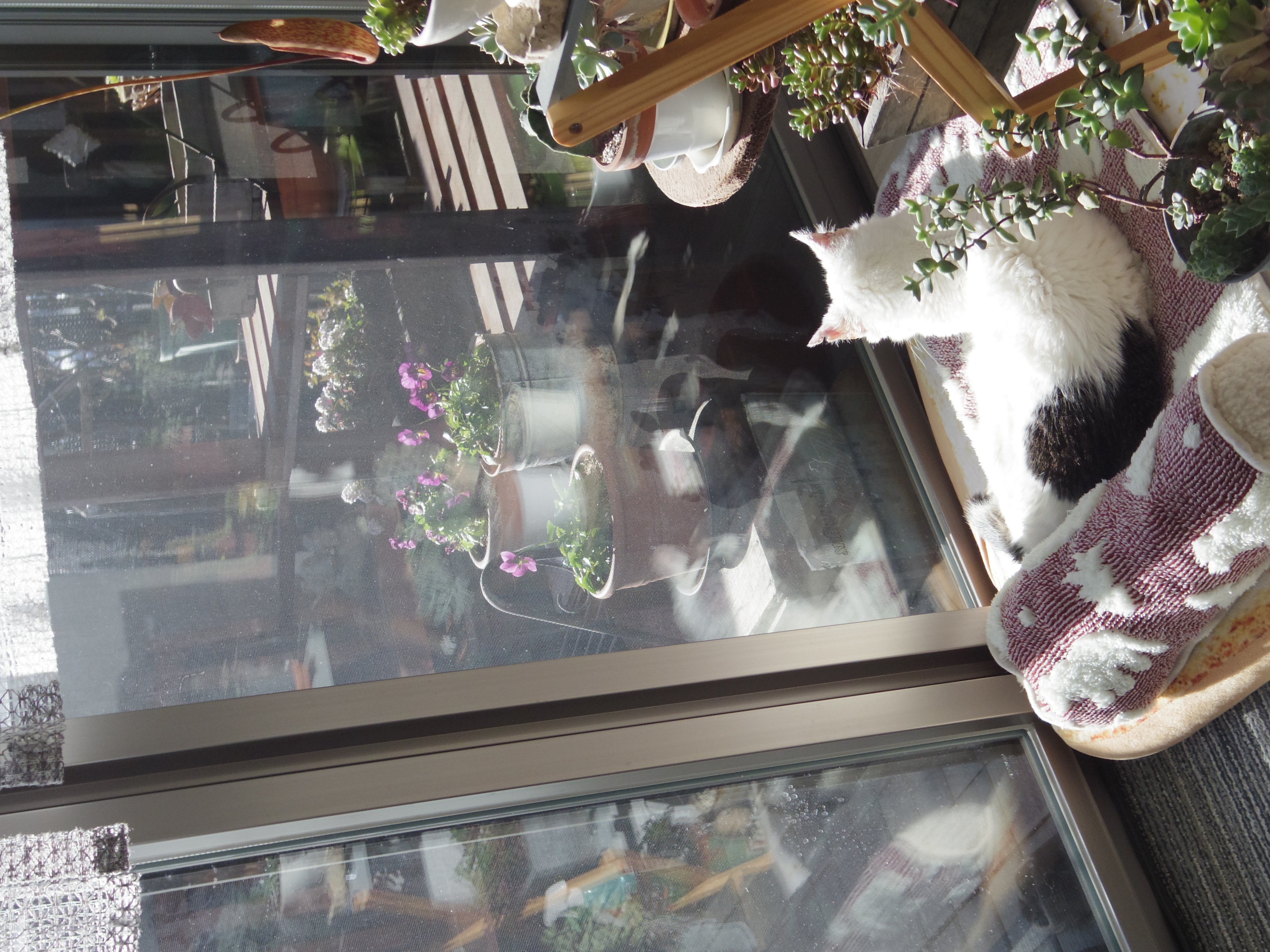 朝6時頃 カーテンを開けると駅の近くの高層ビルの壁に反射した朝日が一直線にうちの部屋の壁に届くミラクル今日は良い風が入りますね北側の部屋の窓も開けて朝の空気を通しましょう風の匂いを嗅ぐチビ季節が変わったのを感じたか?お昼頃になると部屋の中にも太陽の光が入って来るベランダの日陰面積がぐっと狭くなる季節ここには直射日光が苦手な植物が沢山あるので今年は物干し竿を利用して100均で買って来たシェードとスダレを設置しました(洗濯物は干せなくなっちゃうんですが^^;)プリムラ オーリキュラ類 姫海蘭葛 シクラメン ティアレラは真夏じゃない今頃の直射日光でも長時間浴びると弱ってくるお日様が好きなスイートアリッサムの鉢でさえ萎れてくることもあるから9月の太陽は要注意特に最近の日差しは強すぎて人間にもキツイですよね9月って爽やかな日もあれば朝から真っ暗な日もある?カラーなのに白黒写真夜みたい嵐の前触れか?・・・なんと嵐は自分の身に起こった2週間前 朝38度の熱が出たのでお医者さんへ検査をしたらコロナでした「ニンバス」とか言うハリーポッターの空飛ぶ箒みたいな名前の新型コロナ最初は熱だけでちょっと喉が痛いかなという程度だったんですが日に日に症状が悪化して行き発症してから5日目になっても熱が下がらず咳が止まらず倦怠感も酷くて出勤できず結局8日間仕事を休みました味覚障害もありましたお腹がすいて胃袋はグーグー鳴っているのに口が何も食べたくない何を食べても美味しくない今もまだ味覚障害が残っていてコーヒーが飲めません微熱と咳もまだ続いています仕事から帰るともうグッタリでソファーで寝てしまいます「それはコロナの後遺症ですよ1週間ぐらいじゃ治りません 1ヶ月位かかると思って下さい」とお医者さんに言われましたそして「やぶ庭さんにはコロナの薬はあげてないからね」と...お医者さんは5万円だと言ってたけどコロナの薬 そうとう高額なんですねまぁ自分は重症化しなかったということですから処方された風邪薬を飲みながら少しずつ治るのを待つしかないですね 小庭の様子涼しくなるのを待っていたかのようにクレマチスの新芽が出て来ました真夏チリチリ焦げ焦げになって枯れた時にはもう終わりかと思いましたがなんとか生きていたようですアストランチャ・マヨールも小さな花が夏に焼け焦げた葉っぱが痛々しいでも下からどんどん新しい葉っぱが伸びてくるこのマヨールはとても水を欲しがる植物9月になって朝と夕方2回の水やり作業がやっと終わりました今 花らしい花が咲いているのはこのバーベナ・バニティだけ鮮やかな花はあまり欲しいと思わないこのぐらいがちょうど良いこぼれ種の勿忘草の新芽があちらこちらの鉢に出てきましたこれからこのまま厳しい冬を乗り越えて春に沢山の水色の花を咲かせるんですよね家の中では3代目のウツボカズラが誕生伸びすぎた1代目を短くカットしたばかりでしたこれから2代目3代目が元気に育っていくことでしょうあんまりまだ食欲はないけれど朝に食べるパンを焼きました冷めたら1センチ幅に切って冷凍庫にストックしておきますこれでだいたい1週間分です
