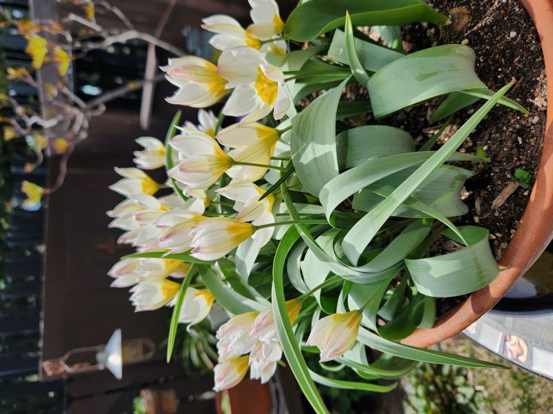 今日は真夏日25度桜も散り始めたようです朝の小庭はまだ春の雰囲気チューリップが咲き始めましたこれから隣に黒いチューリップも咲く予定日中の日差しが強い気がして早々とビオラやプリムラなど暑さに弱い植物を日陰ゾーンに移しましたつい先日やっと冬が終わって不織布温室の毛布を取り外したばかりなのになぁ一昨年のクリスマス時期に購入したシクラメンです去年の猛暑を日陰で乗り越えて冬の間不織布温室の中で過ごしずっと生きてました4月になった途端どんどん花を咲かせています\ 頑張ったね /強健黒オダマキが満開です水仙ティタテイトプリムラ・オーリキュラソードどれが花だかわかりますか?プリムラの季節ですがだいぶ数が減ってしまいました去年の猛暑でほとんどのプリムラが消えちゃったんです生き残った株はまだ小さいけどよく頑張った!フランシスカプリムラの元気な新芽が嬉しい小庭の春と言ったらチョンマゲスミレ今年はほぼ鉢植えで咲きました去年他の植物の生育を阻害するという雑草メヒシバが小庭に大繁殖しその影響なのか地面にはチョンマゲスミレの姿がほとんどありませんまるで鉢の上に避難したかのようですこんな地面からだいぶ高い位置にある鉢の上にもいた~今年はメヒシバを見かけたらすぐに駆除するぞ~~!!だから来年も咲いてねチョンマゲさんラブラドリカはプリムラの鉢を乗っ取ったようですねカワイイから許す(笑)植えっぱなしだけど必ず咲く目玉焼きチューリップ今年で5年目くらいになるんでしょうかビオラもまだまだ綺麗だけど徒長しはじめましたねいつの間にか立派に育ってたこの草!最初は芝生なのかとそのままにしておいたらどんどんどんどん巨大化して手では抜けなくなってしまった!検索アプリで調べたら芝生ではなくオオスズメノカタビラという雑草でしたアプリの診断によると健康状態はかなり良好とのこと...そう言えば秋にビオラの植え替え作業した時大量に肥料をこぼした事がありそれがこの場所だと気がつきました!!納得さようならスズメノカタビラくんスコップで抜いて処分しました