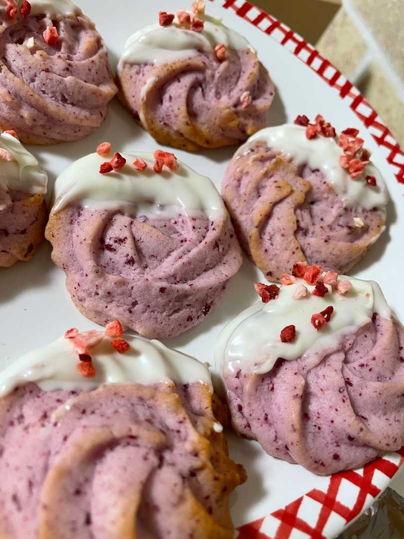お菓子を作りました。 色々見ていて前から作ってみたかった絞出しクッキー! やっぱりきちんとした口金を使わないと、できないんですね! 今回はバッチリ購入したのでいざ!!! 計量して、作り始めたところ…… 早速バターに粉糖を入れなければならないところ、薄力粉に粉糖混ぜて、ふるいにかけちゃいましたー💦 粉糖は混ぜないのが正しいみたいで、バターと混ぜてふんわりするまで練るんだって! 混ざれば一緒!と思い、そのまま進めます。 バターを混ぜて、紫芋パウダーを入れようと思い、ネットで検索すると…… 変色に注意!! らしい…… レモン汁に溶かして入れると鮮やかに! って情報だったので、レモン汁10mlと混ぜました。 水分が足りなかったみたいでボソボソに😰 かまわずバターの中に投入し、ハンドミキサーで混ぜたところ混ざってくれません! これでもか!ってぐらい混ぜたけど、ツブツブが残りました。 諦めて牛乳を入れ、粉を入れ、混ぜ混ぜして、それを絞り袋にいれ絞ってみたら…… なんといい感じなツブツブ感 いちごポッキーみたいになって可愛い✨ クルンと絞り出しで焼いたら可愛い色のクッキーが出来上がりました!