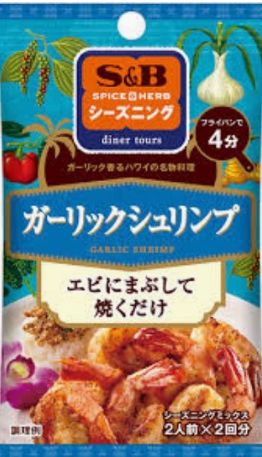 ガーリックシュリンプ 今日はコレを使いました! 簡単に出来てハワイ気分🌺 子供にも好評でしたー!