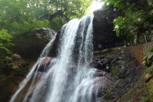 五色温泉から徒歩10分ぐらいの場所の雷滝 落差約30mもある大滝で、雷鳴のように轟音を立て水が落下する姿は迫力満点 滝の裏側から水が流れ落ちる姿を見る事ができ、 別名、裏見の滝とも呼ばれるんだって 物凄い水しぶきで、マイナスイオンがムンムンって感じだよね♪ マイナスイオンが健康にイイかどうかは不明なのだが・・・・ 前日の上高地と同様にヒンヤリとしてて、いつまでもこの場所に居たかったw