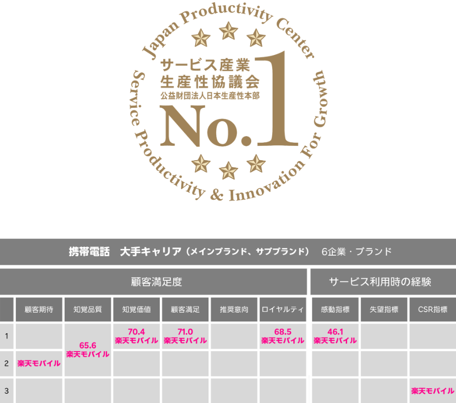 今回の調査では、顧客満足度に関する「顧客期待」「知覚品質」「知覚価値」「顧客満足」「推奨意向」「ロイヤルティ」の6指標に加え、サービス利用時の経験に関する「感動指標」「失望指標」「CSR指標」の3指標で構成されています。楽天モバイルは、このうち「知覚品質」「知覚価値」「顧客満足」「ロイヤルティ」の4指標、そして「感動指標」の1指標において、堂々の第1位を獲得しました。これは、楽天モバイルが提供するサービスの品質の高さ、価格に見合う価値、お客様の継続的な利用意向が強く評価されていることを示しています。特に、「感動指標」での2年連続第1位獲得は、顧客が単に満足するだけでなく、期待を超える驚きや喜びを感じていることを意味しており、楽天モバイルが顧客体験の向上にどれほど注力しているかが伺えます。
