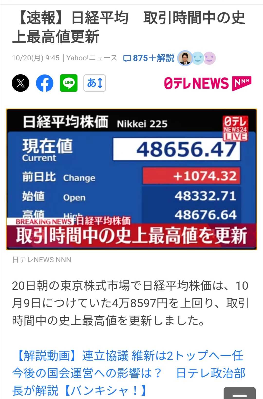 😳 何時まで持ちこたえるか?怖い領域❗🧓 後場 終値 49185.5円 でした。高市政権にボロが 出れば、急落⬇️する❗ので、程々で利食いを お薦めします。😔