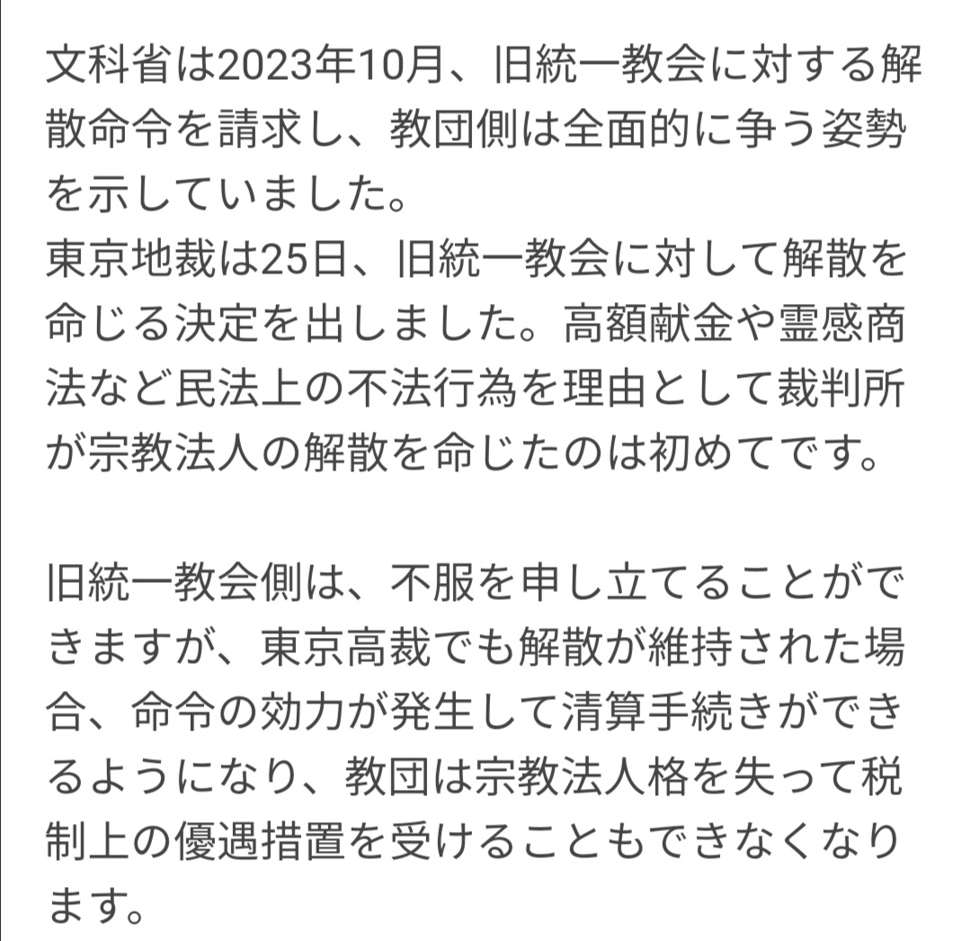 🤨 自民党とベッタリ❗選挙の手伝いも頼りにしていたから 中々こんなにアッサリと解散命令が出るとは❓🤔‼️ でも、本当なら良かったと半信半疑です。