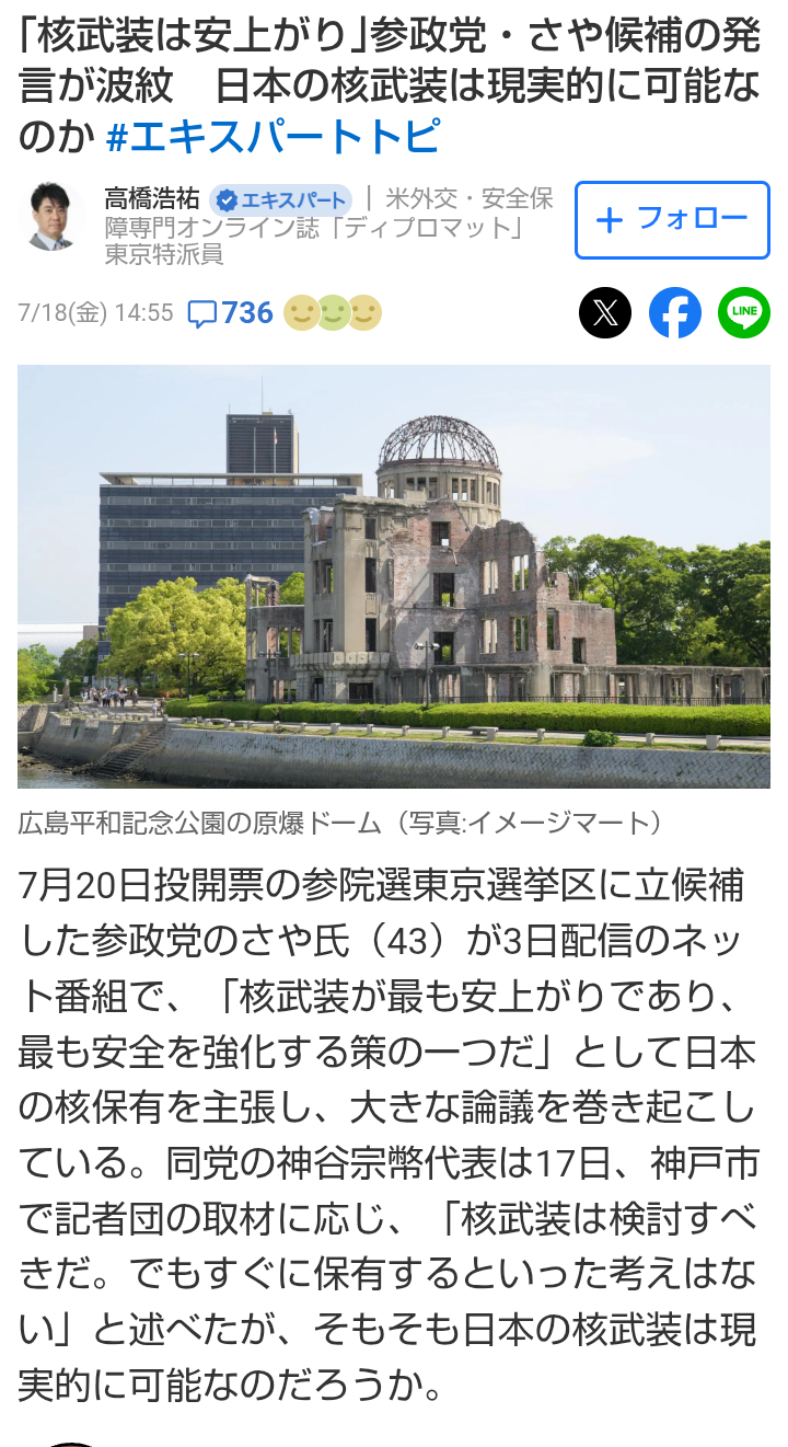 🌚掲げている政策は、れいわ等のいいとこ取りの様に見えるが、核兵器を持つ事を前提に、強い日本を目指し、天皇陛下を中心とした、昭和初期の日本が理想らしい❓