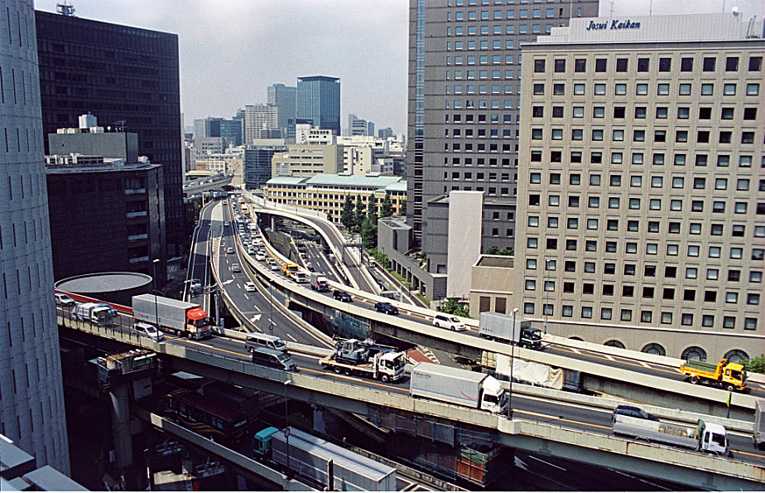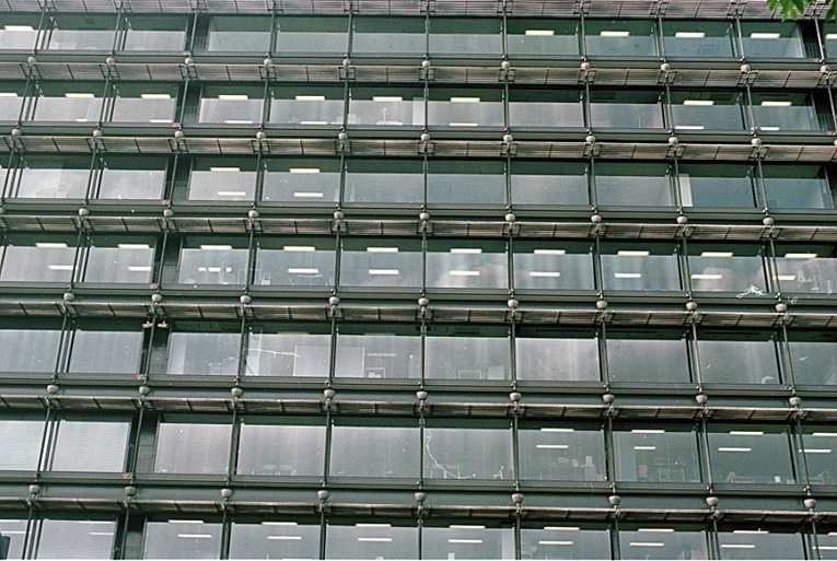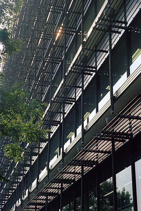 このビルの両側にはこの白い巨大な円筒が2本立っていて、これがパレスサイドビルの印象を強めている一番の要素なんですが、コレじつは巨大なエレベータホールそのものなんです。ふつう、エレベーターって建物の中に設置するんですが、ここでは地下に巨大な印刷工場があるのでエレベーターボックスが入らず、悩んだ末のグッドアイデア、思い切ってエレベータボックス全体をそっくり建物の外に出しちゃった!