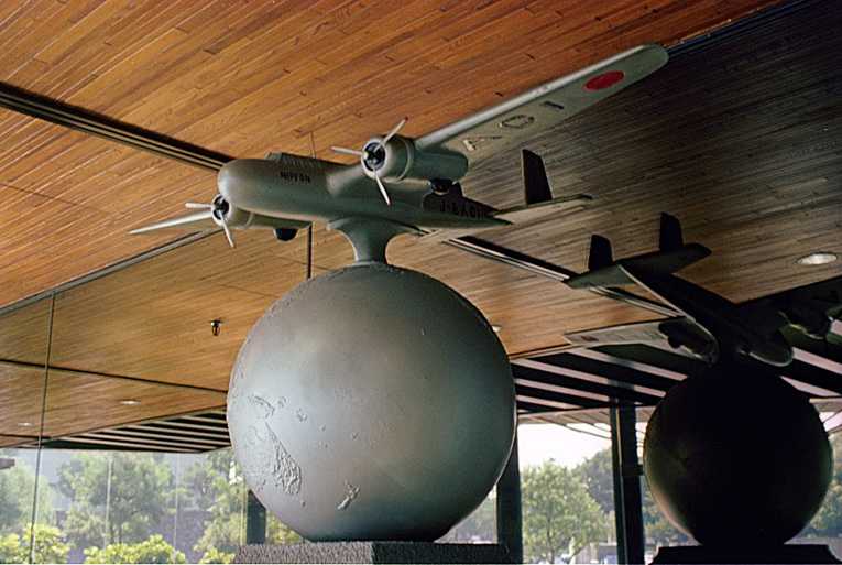 そして、入り口を入るとまず正面にこのブロンズ像が・・・! 昭和14年に世界一周親善飛行に成功した「ニッポン」の記念碑(?)です。この快挙の2年前に朝日新聞社が「神風」という飛行機でヨーロッパまで飛んで、日本中が沸き返ったそうで、それに刺激されたライバルの東京日日新聞(現在の毎日新聞)も、さらにでっかいことやろう燃えたんでしょうね。どこぞの会社みたいに創業者の胸像など置いていないところが、いかにも新聞社らしくて大いに気に入ってハナから好印象!
