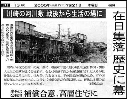 もうかなり昔の事(2005年)になりましたが、当時の7月21日付の朝日新聞朝刊・神奈川版に「在日集落 歴史に幕」というかなりスペースを割いたコラムが掲載されました。この記事でわたしが反応したのは本見出しではなく中見出しの方で、ご覧の通り「川崎の河川敷 戦後から生活の場に」という一行に眼が釘付けになりました。 もしかして・・・あそこのことかな??? 読者の方の中には既読の方もいらっしゃるかもしれませんが、わたしは数年前、このブログに「冷麺の味」と題する在日朝鮮人の少年との交流を綴った記事を書いたことがあるのですが、この新聞記事はその題材になった場所のことではあるまいかと思ったのです。しかし、あの記事の記憶から半世紀以上が経過しています。いくらなんでもあの鶏小屋より粗末だった掘っ建て小屋の集落が今日まであるわけがないなと脳みそを納得させようとしたのですが、この記事には詳しい場所の地図まで示されていたのです。その地図を一目見た瞬間、あのときのあの場所だ、間違いない、と・・・。 その後は記事の一行一行を何度も読み返し、今日現在のあの場所に想いを馳せたのでありました。(コラムの実物はコチラ↑) この記事の掲載後、7月も終わろうとしているある日、猛烈な暑さに襲われながらも行きたい・見たい・逢いたいの一心で当地に出掛けてきました。 その時は、絶対に失敗無くしっかり記録に残そうという想いが強かったので、記録写真機としては打って付けと思われる昭和の中盤時代に新聞報道カメラマン達が愛用していた中判のそれも6×9判の「マーシャルプレス(1966年製)」という大きなカメラを引っ張り出して望みました。このカメラは、実に冷徹なまでに有りのままの情景をその場の空気まで包み込んでしっかりと記録してくれるニッコールレンズの付いた信頼度120パーセントのカメラです。これをメイン機に据え、小型35ミリ広角カメラを幾つかサブで携えていくことにしました。 現地に着いてみると、新聞に書いてある通り当時とは違ってかなり部落が膨張しています。家々の個数からするとざっと10倍以上には膨れていましょうか。通りすがる住人の方々と挨拶を交わしながら、複雑に入り組んだ家々の中心部に向かって進んでいきます。しかし、ここにお住まいのみなさんはどういうことなのでしょう、わたしは風体からして、だらしのない中年男でそれにカメラなど何台もぶら下げた怪しいよそ者なのですが、こちらの皆さんは若い方(といっても30代半ばくらい)もお年寄りもみなコチラが「こんにちは・・・」と言う前に皆さんの方からニッコリ微笑まれて「こんにちは」と挨拶されてしまうのです。今までに知らない街に入ってこのような接し方をされた経験がありません。どう見ても暮らしぶりが厳しいことは瞬時に分かるのですが、心根は全く逆で心中豊かな方達であることがすぐに理解できます。幾人かの方々に許可をいただき、建物の写真を撮らせていただき、また昔のことなどいろいろお話しを伺うことも出来ました。例の少年やお母さんのこともお訪ねしたのですが、なにしろ45年も昔のこと、こちらの記憶もかなり危うくなってしまっていて、はっきりとしたことは分からず手掛かりを得ることもできなかったのですが、わたしはそれでも充分に満足がいきましたし、むしろあの幼き日のむず痒い思い出は霧が晴れない方がいいのかもという心境になったりしたのでありました。以下の写真、●マークの付いたものが「マーシャルプレス」での写真です●マークはリケノン28mm/2.8を「ペンタックス・スーパーA」に装着して撮ったものです●マークは「ペンタックスPC35AF」で撮ったものです ●あの日、少年のあとについて辿った土手下の道ですいまでも、おなじ道の幅、おなじ草の匂い・・・●かなり背の高くなった夏草が無造作に繁茂する中を掻き分けていくと・・・うん?・・・ここだったかな???●岸辺側から・・・素人の手作りでしょうか、バラックがびっしり建て込んでありました●このような家並み(?)が続きます●土手側に回って、集落の入り口付近昭和39年(1964)東京オリンピックの年にここは電気がひかれたそうです私が初めて来た当時はランプを灯していましたよ●●●家々で取り囲むようにして集落の中心あたりに猫の額ほどの耕作地がありますそこでは、朝鮮の食卓には必需品のエゴマやトウガラシが・・・●立ち退きのことなど、お話を伺いましたが、「やはり住み慣れたところを離れるのはね」と寂しそう・・・●かつてはこの集落の中に焼肉店までもがあったと教えて頂きました●集落の下流側にはなんと3棟の集合住宅まで出来ていました●中心に通路があり部屋は左右に分かれて付いています一部屋の広さは6畳一間ほど・・・●共同の水道場、水道は40年ほど前に引かれたと聞きました水道が来たことで、急速に人口が増えたとも・・・小さなバラック仕立ての教会があり牧師さんもいらっしゃいますき