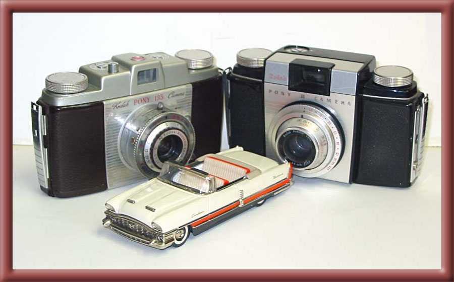 第2次世界大戦で勝利した連合軍側は、その後の世界を牽引して行くわけですが、とりわけリーダーだったアメリカはヨーロッパ諸国とは違って自身の国土が無傷だったことで、戦後復興に一切の費用が懸からなかったわけですから、これは傷ついた他の国々とは大きく事情が違ってきます。元々経済的には優位に立っていましたが更に輪を掛けて拡大していきました。ソ連が大きく台頭してくる1960年あたりまでは我が世の春を謳歌するんですね。人々は派手なツートーンカラーのオープンカーでドライブ、日が落ちるとジンやバーボンを呷りジャズのリズムでダンス・ダンス・ダンス・・・。当然この恩恵は子供達にも舞い降りてきて、男の子たちはプレスの効いたズボンにフラノのブレザージャケット、女の子も裾が大きく拡がった可愛いレース地のフレアースカートを着せてもらって白いソックスにピッカピカの革靴・・・。おぉ〜何とリッチなことでしょう。 その当時、たまたま日本に生まれてしまったわたくしは、尻や膝に継ぎ当てをしたズボンを履き、すり切れた先から親指が覗くアサヒのズック靴を素足で履き、学校給食で出されるアメリカさんから供与された脱脂粉乳を「美味しい・美味しい~」と言って飲んでいたんです。周りを見渡したところで、ジャリ禿の修君もお転婆なユリ子ちゃんも一年中鼻を垂らしていた良平君も皆同じ様な状況でしたので、これがスタンダード。別に貧しいなぁ~とか、悲惨だなぁという思いは全くありませんでした。 そんな時代背景の基にアメリカで誕生したのが今回のテーマ「Kodak Pony」です。スタイルや仕様、ネーミングを見ると正面切って大の大人が使うものではなく、かといって玩具というほどチャチなものでもないので、少年少女をターゲットにして作られたカメラに間違い無いでしょう。 単に「Pony」といっても1950年に初代が誕生し、62年までに細かな変更を加えて6機種のPonyが製造されていました。いま私の手元にあるのは、55年製の「Kodak Pony 135 Model C」と57年製最終型の「Pony II」の2台です。左は1955年製「Kodak Pony Model C」、右は1957年製「Kodak Pony II」、'57 パッカードコンバーチブルクーペと共に 「Model C」は、ハーシーのチョコレートのような色をしたベークライトボディに44mm, f/3.5の3枚玉レンズ、前玉回転式の焦点調節、絞りは3.5から22まで選べ、シャッターもバルブはもちろん1/25から1/300まで4速が選べる本格的な物が使われています。コダックのカメラは伝統的に初級者を意識した作りがしてあって、このカメラにも絞り表示にはf値のほかに英語の文字による明るさの表示が鏡胴のプレートにプリントしてあります。Kodak Pony Model C またレンズリング正面 には目立つ赤い数字で絞りの変化による深度が一目で分かるリングが装着されており、このカメラを子供達が使うことで写真機の仕組みがしっかり憶えられるような教科書的な作りのカメラになっています。 もう一方の「Pony II」は、正面のメタルプレート以外は全身黒のベークライト製で直線を使ったデザインがやや近代性を感じさせます。しかし、レンズは3枚玉は変わらぬものの44mm, f/3.9とややスペックダウン、前玉回転式で焦点調節も出来るのですが、絞り調節がf値ではなくEV(エクスポージャーバリュー)式に変わってしまい、絞り羽の枚数も菱形の4枚(C型はほぼ円形になる6枚)、シャッターも約1/50秒位の単速になってしまっています。これは一体どのような計画で造られたものでしょうか、これでは標準的な写真の基礎は覚えられませんね。これがコダック流の進化なのでしょうか、どうもよく理解できません。 コダックという会社が写真の歴史に関して貢献したものは、質、量共に膨大なものであることは世界中の誰もが認めるところですが、一方でアメリカ合理主義に基づく切り捨てについても考えさせられることも多いですね。特にフィルムフォーマットに関しては直接会社の利益に結びつく事柄なので、手を変え品を替えということが起きてきたわけです。 今回のPonyシリーズは、たまたま35ミリフィルムを使用していましたので、今日でも問題なく使えますが、126・127タイプ等、今では消えてしまったフォーマットだと撮影に要する労力よりフィルム調達の苦労の方が多くなってしまうので、カメラだけが残って路頭に迷ってしまうことになります。同様に現在のデジタルカメラにしても記録メディアやPCとの接続方式が短期間で進化してしまうのでライフタイムは更に短くなってしまうと思われます。 使ってみた印象は、下の作例をご覧頂けば一目でお分かり戴けると思いますが両機ともに共通してアンダー部をいとも簡単に省略してしまい、立体的な表現をすることが非常に難しいレンズです。製造目的や価格からすれば、そう気を入れて作られたことではないにしても、かなり端折りすぎではないでしょうか。現代の高密度な感材を使ってもこの通りですから、当時のフィルムでは更に解像が悪化し